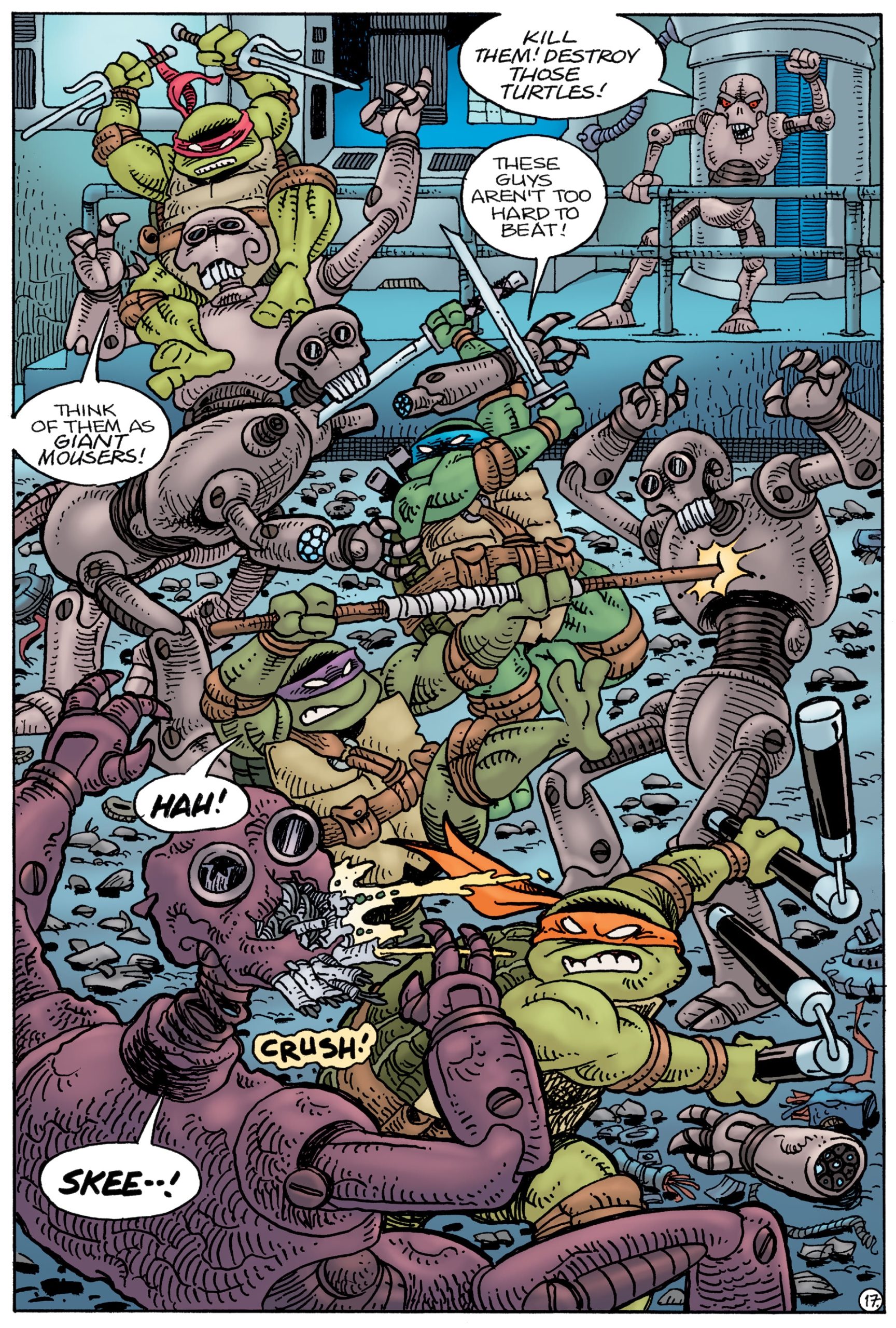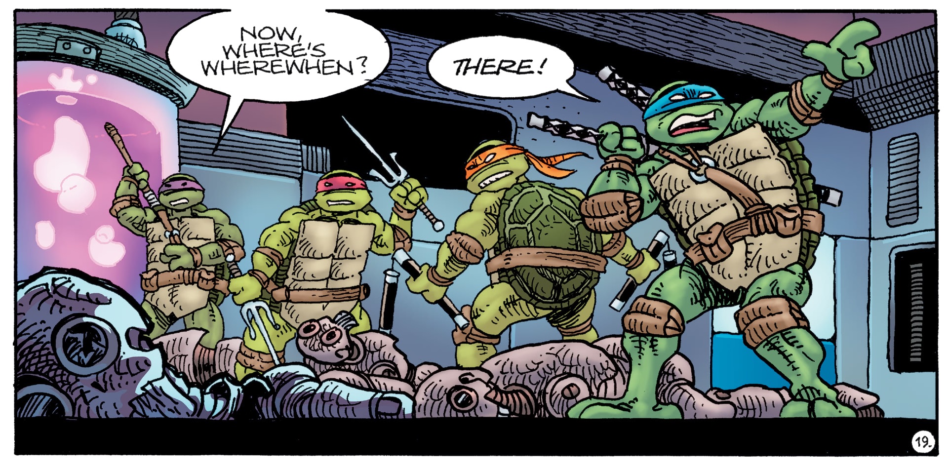 Les ninjas faisaient leur entrée avec fracas. S’attendant à leur arrivée, Wherewhen envoyait une armée de robots conte les assaillants. En quelques minutes, les fantassins étaient neutralisés. Craignant le pire, Wherewen programmait sa machine à voyager dans le temps pour remonter quelques années dans le passé. Il voulait se débarrasser des tortues, trop gênantes pour ses desseins. Raphael l’empêchait de gagner la chambre de transport temporel. Mais le génie du mal disposait également d’une machine connectée à son poignet. En un clin d’œil, et un halo de lumière, Wherwhen disparaissait.