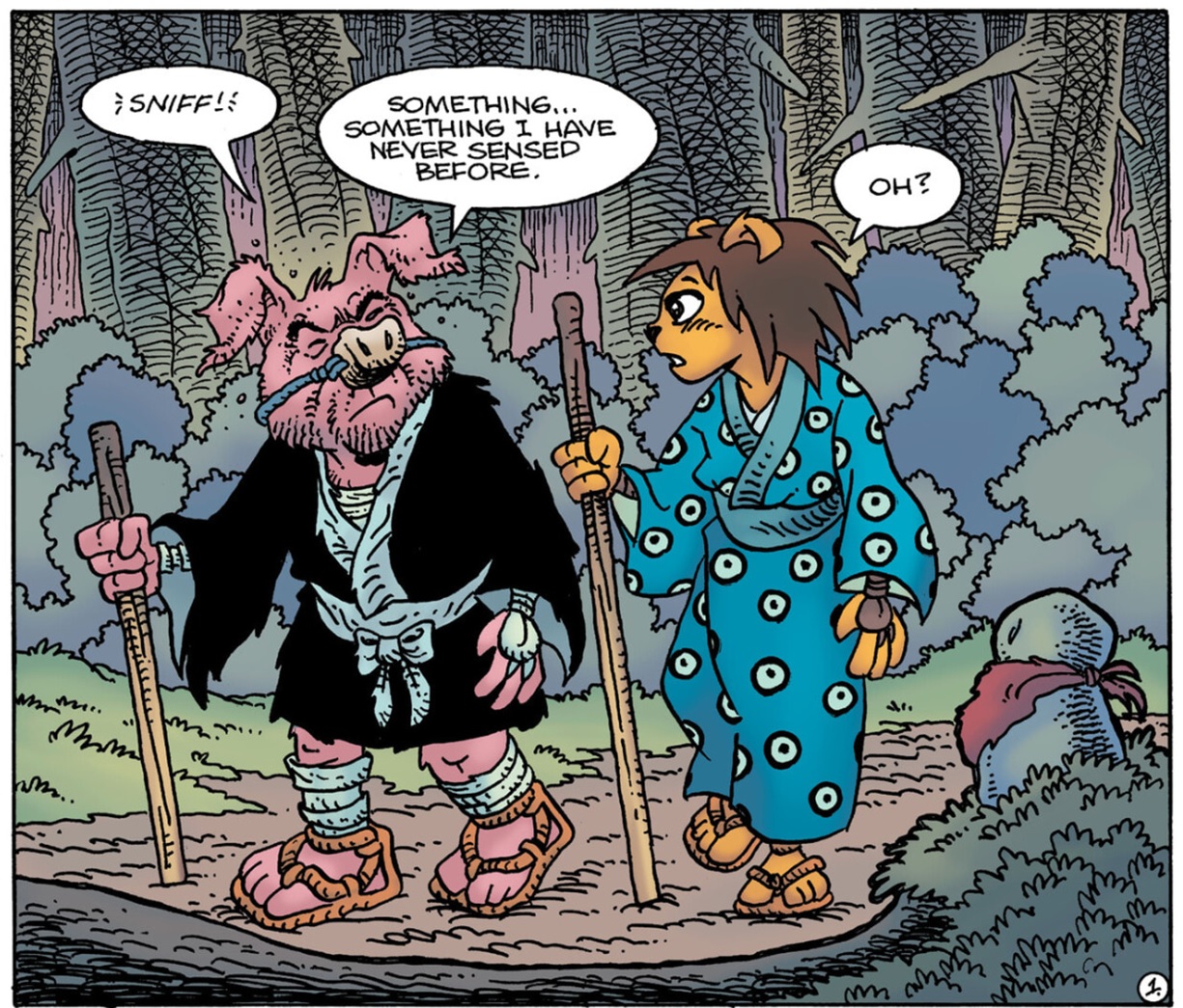 Le campement était encore endeuillé par l’attaque du clan Mogura (Wherewhen #3). Tomoe Ame se montrait très inquiète pour Usagi et les tortues, partis à la recherche du seigneur Dokoitsu. S’il était réellement Wherewhen, leur combat serait très risqué. Le seigneur Noriyuki se tenait à ses côtés pour essayer de la rassurer. Il se faisait alors interrompre par son conseiller Horikawa. Celui-ci lui recommandait de plier le camp et de repartir au plus vite en direction du nord, pour affronter leur adversaire Hikiji. Le temps jouait contre eux. Il craignait que cela permette au seigneur rival de rassembler plus d’hommes. Il n’en était clairement pas question pour Noriyuki, qui voulait accorder une journée de plus aux blessés et aux endeuillés. Même si cela irait à l’encontre de l’avis du shogun. Chaque soldat était précieux et leur remise en état, au vu de leur armée, était cruciale.