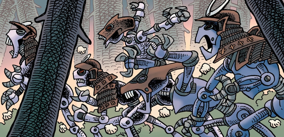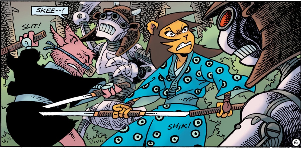Au campement, Tomoe était rejointe par Gen, qui cherchait à surmonter son deuil. Il ne comptait pas rentrer et assister à la cérémonie funéraire de sa femme, Kitsune, tuée lors de l’attaque des taupes (Wherewhen #3). Sa fidélité à Noriyuki était bien plus forte que tout. Mais soudain, ils entendirent quelque chose dans les bois en contrebas. Des nuages de poussière sortaient de la cime des arbres. Les samuroïds approchaient du camp !