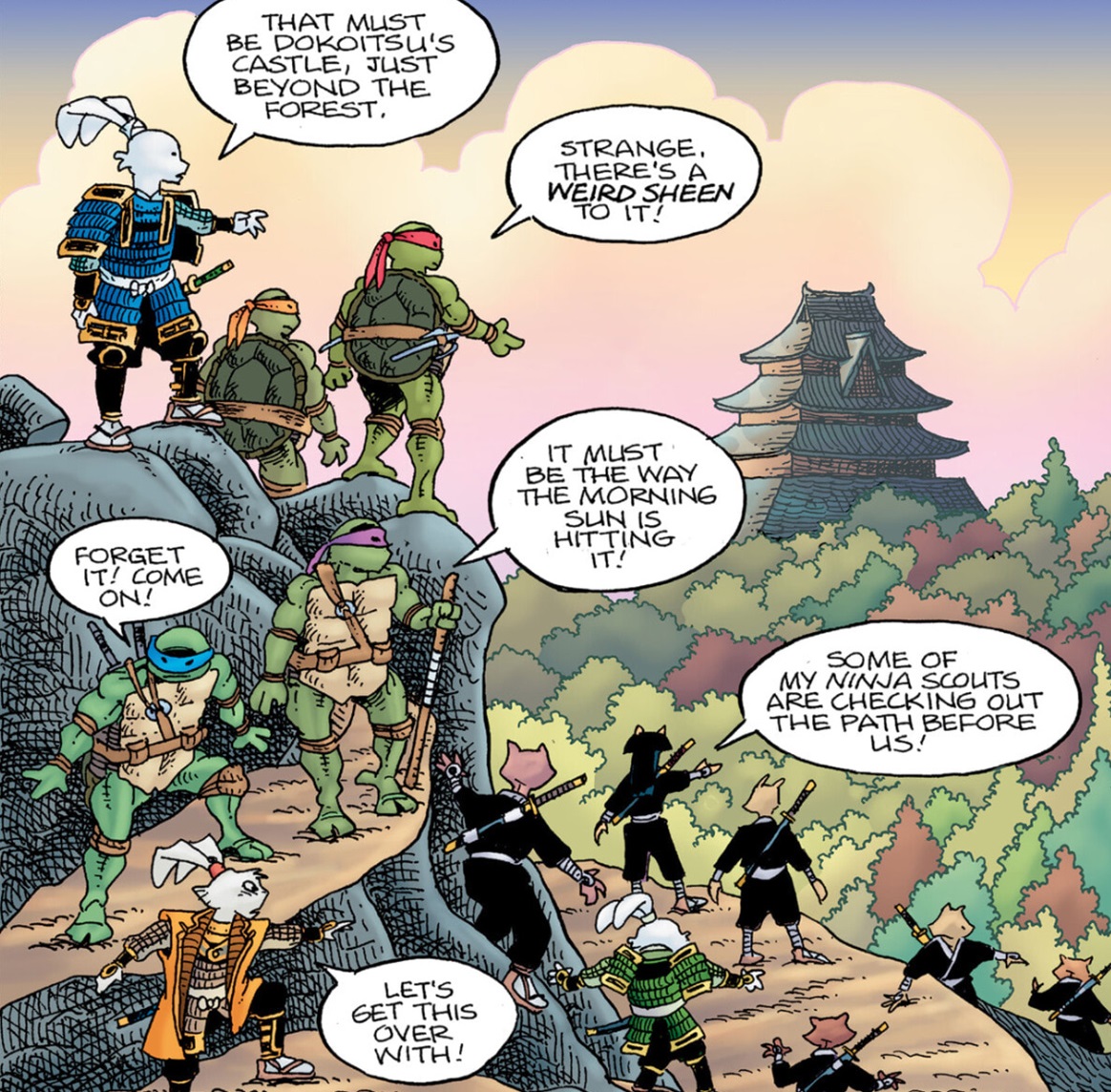 Après plusieurs heures de marche, Usagi avait conduit les tortues sur un promontoire rocheux qui donnait une vue exceptionnelle sur la forteresse du seigneur Dokoitsu. Tous étaient très étonnés de la lumière qui émanait autour du château. Donatello supposait que cela venait de la lueur du lever du soleil. Mais rien de moins sûr ! Ils se rapprochaient de leur but.
