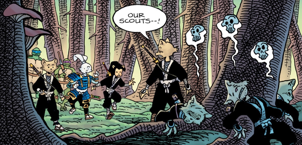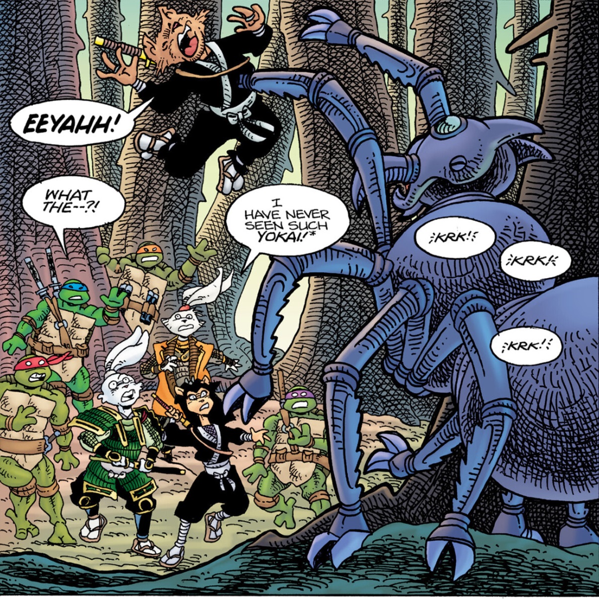 Un groupe de ninja accompagnait Usagi et ses compagnons reptiles à travers la forêt. Mais les éclaireurs n’étaient pas encore revenus, ce qui inquiétait le chef de l’expédition. Il ne tardait pas à les retrouver morts. Leur cadavre présentait d’importantes lacérations. Déchiquetés, personne ne reconnaissait ce type d’attaque. Bientôt, un autre ninja disparaissait. Mais cette fois, il était retrouvé non loin, poussant des cris atroces. Devant eux se trouvait une araignée géante. Trois autres de ces créatures apparaissaient au même moment. Les tortues sautaient sur les créatures, armes en mains. Les yeux n’étaient pas crevés mais cassés. Les lames entraient dans le ventre de ces choses, qui déversaient un étrange liquide au sol. Les pattes sectionnées laissaient voir de surprenantes étincelles. Rien n’était d’organique chez ces créatures. Il s’agissait de robots ! Bientôt, les quatre machines étaient neutralisées. Mais une question demeurait. Comment, dans ce monde encore relativement archaïque, proche du Japon médiéval terrien, de tels robots pouvaient-il exister ? Donatello ne trouvait pas d’explications. Leonardo se demandait quant à lui si cela ne venait pas de la captation de l’énergie du soleil. Une des seules options de Wherewhen pour canaliser de l’énergie. Son frère au bandeau violet faisait immédiatement le lien avec l’étrange lueur qui émanait du château de leur ennemi. Il était constitué de panneaux solaires ! Le château était à la fois un immense générateur d’électricité et une batterie à lui seul !
