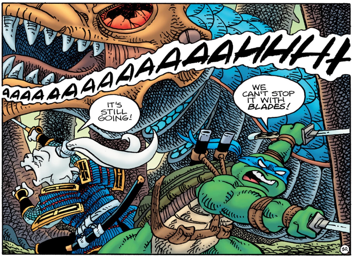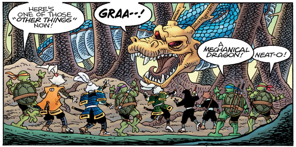 C’est alors qu’une autre machine apparaissait. Un dragon ! Ils ne devaient pas être loin du château. Wherewhen y avait placé des gardes pour le protéger. Le robot était bien plus résistant que les précédents. Les tortues et Usagi ne parvenaient pas à prendre le dessus. Soudain, une ninja lança une bombe dans la gueule de la créature de fer, ce qui faisait exploser sa tête.