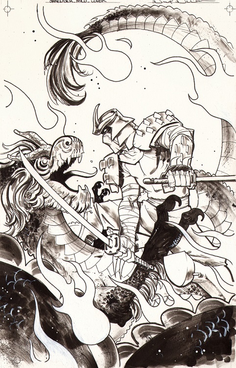Il avait gagné son armée. Il ne lui restait plus qu’à lancer le siège sur la forteresse. Fondant sur la garde du bâtiment, composé de créatures à la peau jaune, il ne tardait pas à se frayer un chemin vers l’entrée, laissant sa chair à canon sur le front. Pénétrant dans le château il constatait à sa grande satisfaction que toutes les armées étaient à l’extérieur. Entrant dans une pièce au baldaquin jaune, unique couleur vive dans un lieu terne, il vit assis sur un trône celui qu’il cherchait à vaincre. Vêtu d’une armure de samurai, l’individu se levait en direction de Saki. Tous deux brandissaient leurs sabres. Le nouveau venu ne tardait pas à constater que le maître de la maison était un adroit guerrier. Toutefois, certains signes ne trompaient pas, principalement son souffle et l’ancienneté de son armure. L’homme était vieux et n’offrirait pas une longue résistance à Oroku Saki. villains-micro-series-shredder-comic-idw-8-shredder-demon-tortues-ninja-turtles-tmntIl lui tranchait les tendons à l’arrière des jambes, forçant le samurai à s’agenouiller face à son adversaire. Le combat était terminé. Le perdant dit quelques mots, certain de sa victoire au début du combat, il demandait à Saki de l’achever. L’homme s’exécutait et planta son sabre dans le torse de son adversaire vaincu.