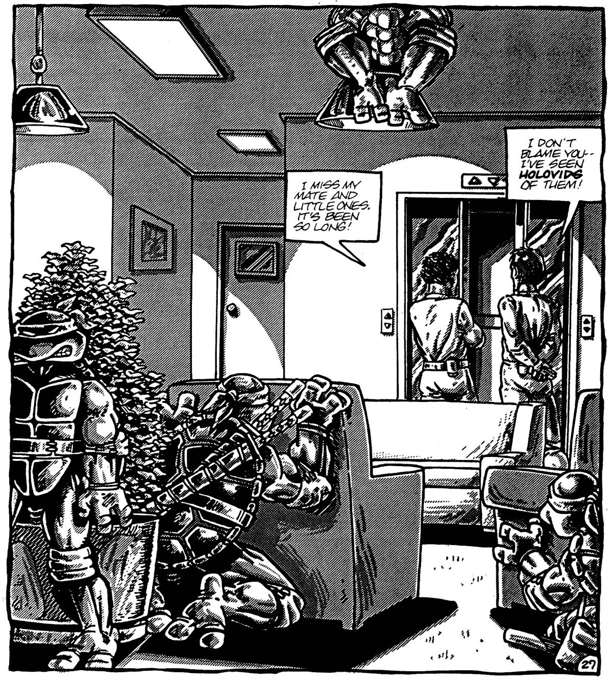 Mais soudain, leur discussion prenait un terme avec l’arrivée inattendue de ninjas. Le Foot Clan était toujours là ! Les soldats les encerclaient pour venger la mort de leur maître Shredder (TMNT (Vol. 1) #1). Malgré leur nombre, les fantassins du Foot Clan ne faisaient pas le poids et les tortues s’en défaisaient sans trop de mal. Leonardo tranchait le ventre de l’un de ses agresseurs, tandis que l’autre chutait du toit. Donatello envoyait voler son bâton au visage de l’un des ninjas tandis que Michaelangelo jetait à terre son lot de guerriers. Seul Raphael montrait des difficultés, assailli par de nombreux hommes qu’il retenait de ses saïs. Mais un autre ninja fondait sur lui et les emportait tous dans le vide. La tortue se rattrapait in extremis à une corde à linge et fracassait une fenêtre dans son élan pour pénétrer dans le salon d’un couple dont la soirée ne faisait que commencer.