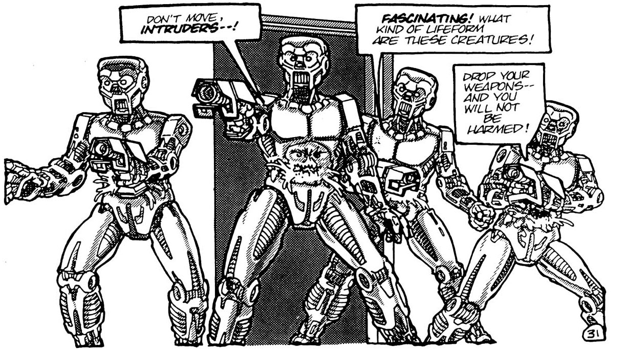 Au même moment, des robots humanoïdes entraient avec des armes. Il s’agissait des locataires du lieu, des extraterrestres roses qui pilotaient ces machines. L’alerte avait été donnée dans les laboratoires, les créatures rosâtres se hâtaient pour intervenir, sans prendre le temps de revêtir leurs peaux synthétiques. Les mutants étaient tenus en joue par les envahisseurs, qui étaient surpris par l’apparence non-humaine de ces intrus. Ils faisaient feu mais devaient faire attention de ne pas endommager leurs appareils des tirs lasers.