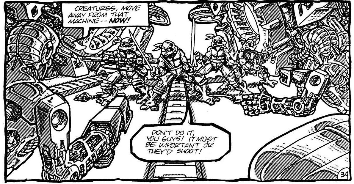 Les quatre frères esquivaient les tirs rapidement et s’en prenaient aux robots qu’ils détruisaient rapidement de leurs armes. Ils en profitaient pour se réfugier dans une autre pièce. Rien de bien rassurant pour les extraterrestres, puisqu’il s’agissait de la salle de téléportation. Les tortues étaient fascinées par le niveau technologique qui se trouvait là, bien différent des constructions humaines. Les portes étaient fermées, impossible de sortir de là. Les extraterrestres entraient à leur tour, toujours des armes à la main. Leonardo avait bien compris ce qu’il se passait ; ils n’avaient pas intérêt à tirer, cette pièce devait être extrêmement sensible.