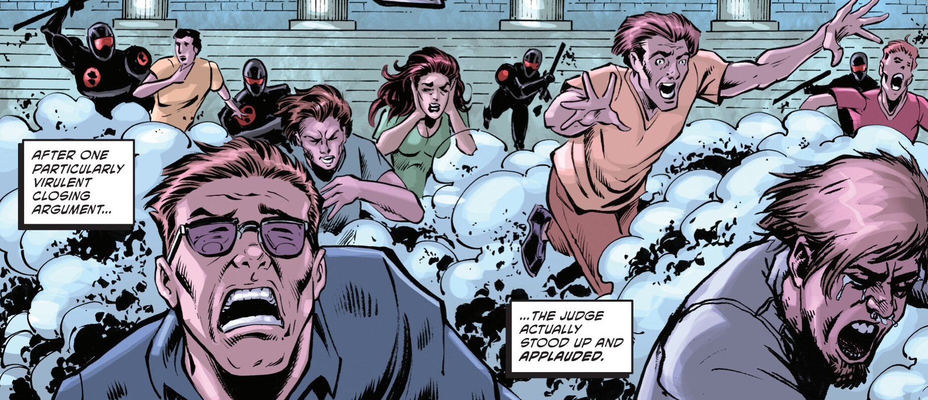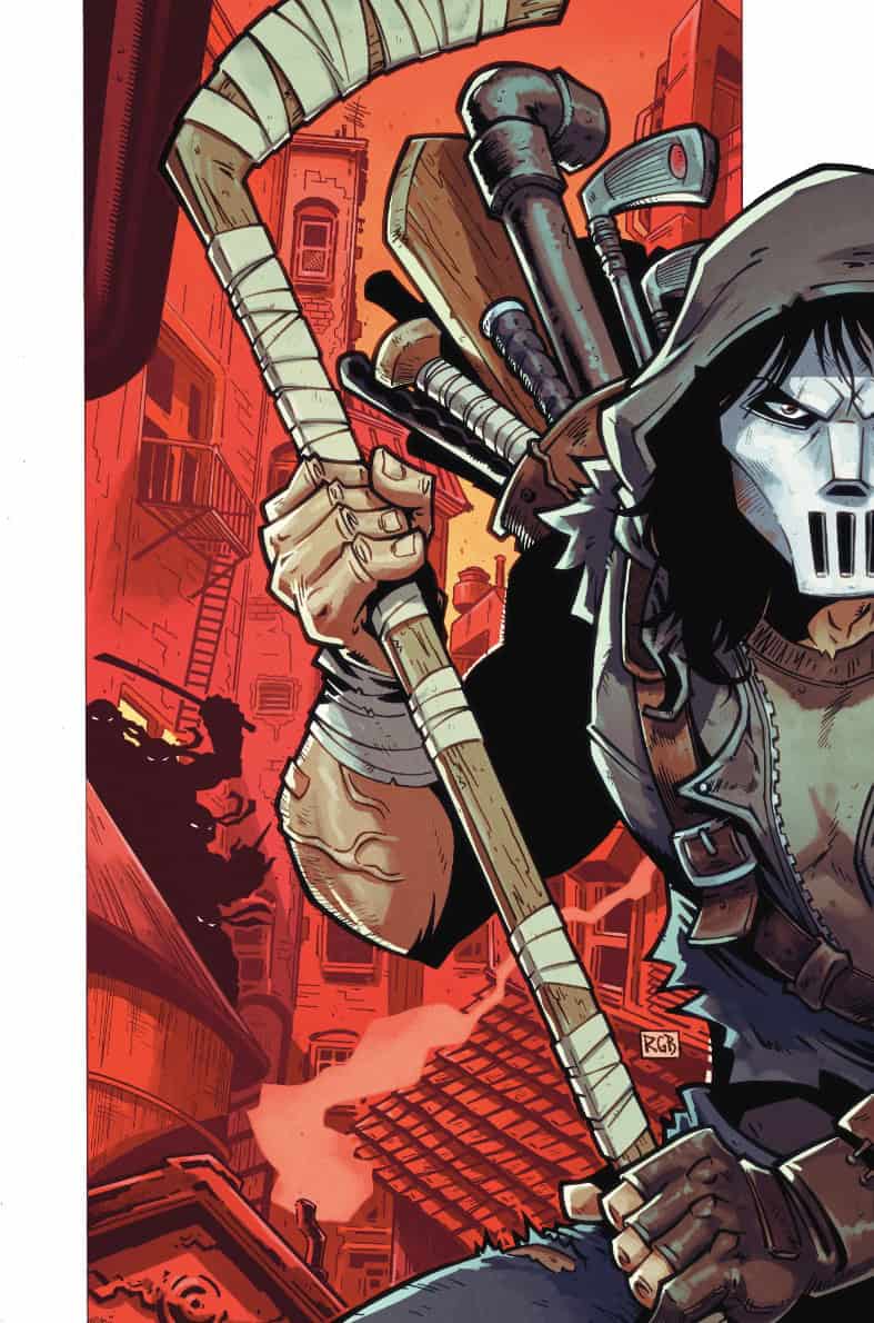 Dans les rues, la cohue s’était installée. La patrouille Foot utilisait du fumigène pour écarter les derniers manifestants. Dans l’épais écran, un homme s’avançait vers eux, crosse de hockey à la main. Il s’agissait de Casey Jones. Il faudrait plusieurs minutes et une douzaine d’hommes lourdement armés pour neutraliser le justicier au masque de hockey. De quoi impressionner Hale, qui retrouvait le jeune homme capturé dans un bâtiment désaffecté.