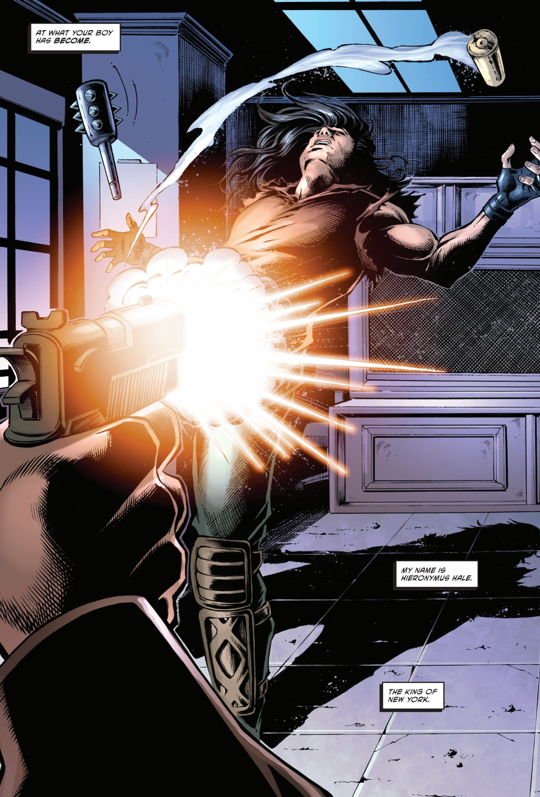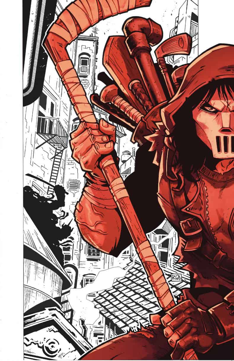 Dans un élan de bonté, Hieronymus Hale lui offrirait la chance qui lui avait été offerte par le passé. Il brandissait la masse de Karai et la jetait au sol. Il dictait ses conditions à Casey. Il serait relâché et bientôt, il n’y aurait plus que les deux hommes et cette arme. Aucune charge ne serait retenue contre lui. Quel que soit l’issue de ce combat. Casey ne revenait pas de ce qu’il entendait et se précipitait sur la masse. En quelques secondes, Hale se remémorait tout ce qu’il avait accompli depuis son pacte avec le Foot Clan. Des choses qu’il n’aurait jamais crues possibles, comme le meurtre de son rival des urnes (TMNT (Vol. 6) #1). Le meurtre du mutant qui lui avait enlevé ses parents, une fois son entrevue avec Karai terminée. Face à lui se tenait Casey, qui brandissait l’arme et demandait à ce que ce petit jeu prenne fin. Il voulait partir. Que cette mascarade prenne fin !