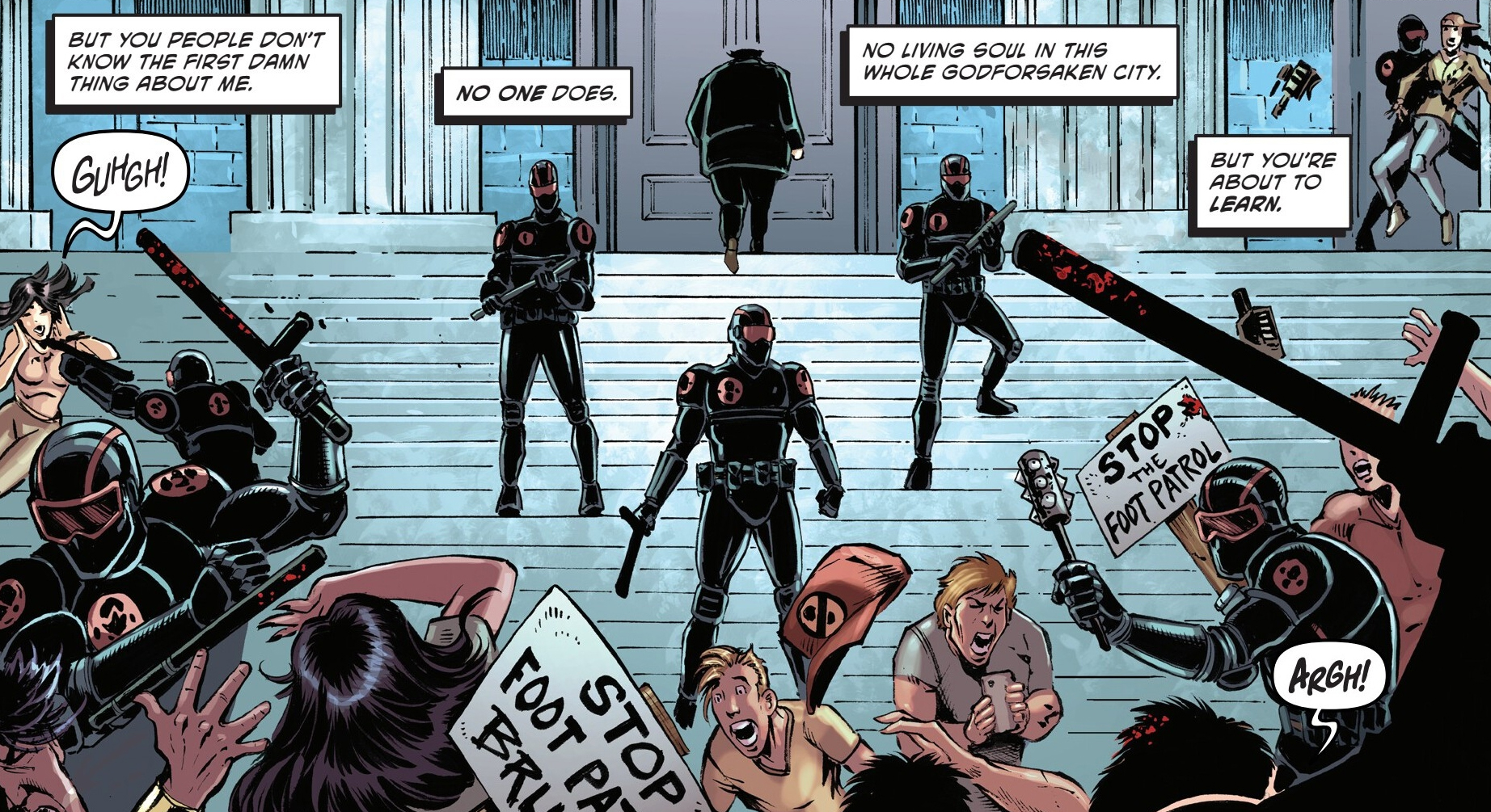 Le nouveau procureur général Hale entrait à la cour de New York, escorté de sa nouvelle patrouille Foot. Des barrières avaient été dressées autour des civils venus l’acclamer, ou au contraire le huer. C’est que ces dernières semaines n’avaient pas été de tout repos pour les new-yorkais, qui brandissaient des panneaux à l’encontre de l’élu. Un micro de Channel 6 se glissait hors des barrières pour poser la question gênante. Qu’avait-il à déclarer face à la répression ultra-violente de ses patrouilles à l’encontre des mutants ? Hieronymus Hale n’avait pas de temps à perdre et ne répondrait à aucune question. Jamais. Il continuait de gravir les marches du palais tandis que ses soldats se postaient pour empêcher d’autres journalistes de l’atteindre.