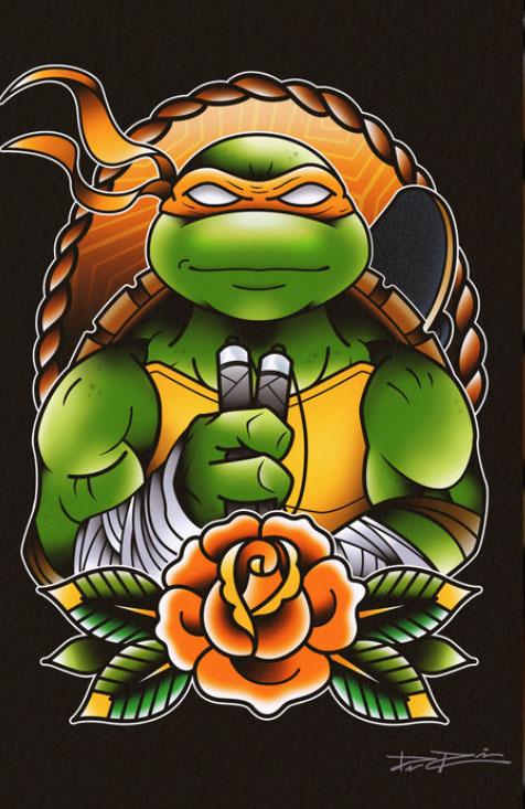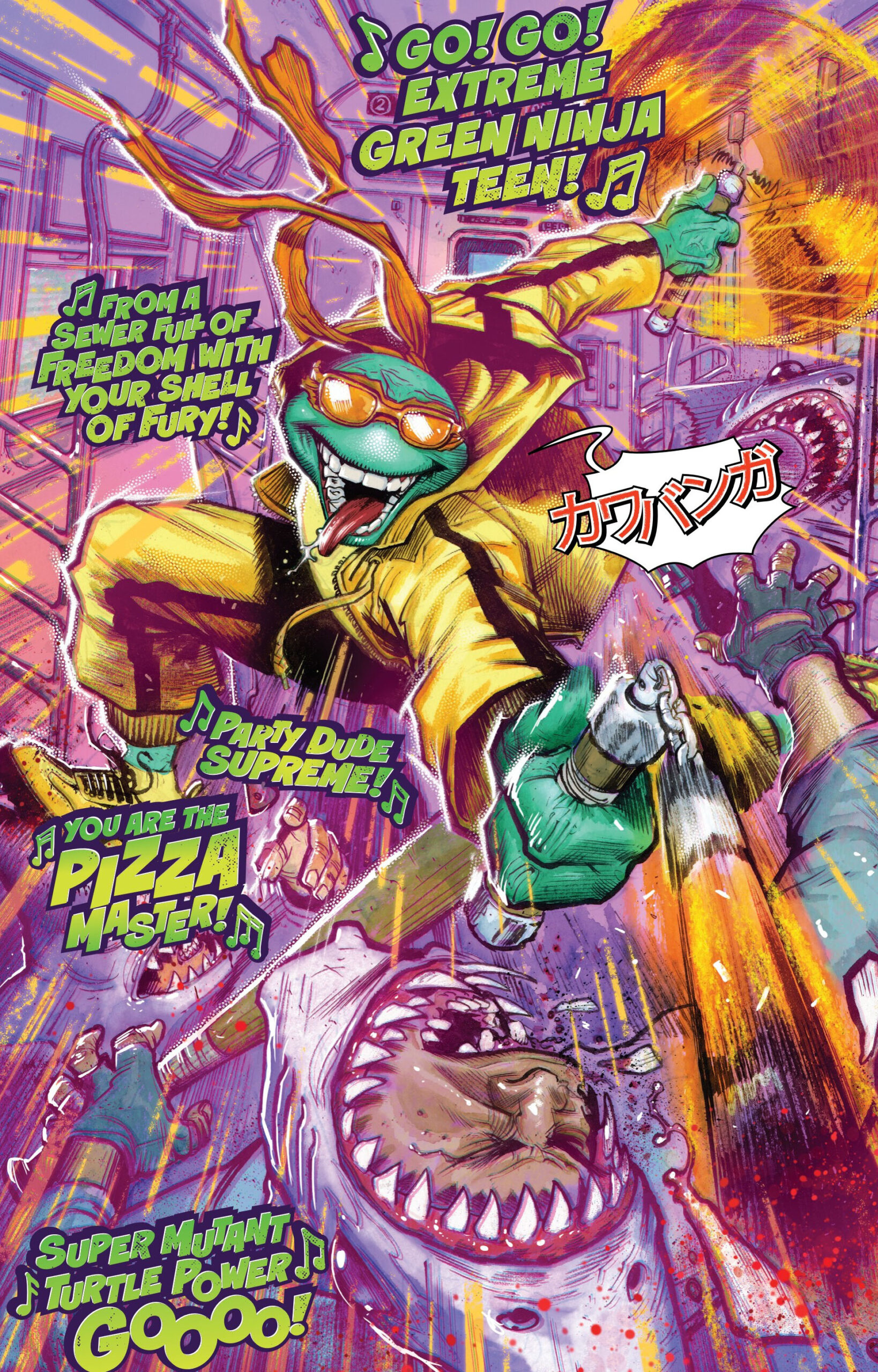 Michelangelo s’était assoupi dans le wagon d’un métro. Il se faisait réveiller par un mystérieux homme qui cachait son visage derrière une capuche. Il poussait un caddie qui contenait un t-shirt à l’effigie de la tortue dans l’une de ses séries japonaises. Il demandait au mutant sous couverture de prendre garde s’il ne voulait pas se faire agresser par les Metro Sharks. Encore étourdie par sa reprise de conscience, la tortue pensait être face à un fan de sa série, avant de revenir à la réalité. Impossible de savoir où il avait eu ce t-shirt. Mais très vite, ils se faisaient tous deux interrompre par trois hommes qui portaient des masques de requin sur la tête. Le sans-abri recommandait au mutant de prendre la fuite dès que les portes du métro s’ouvriraient. Mais Michelangelo avait une autre idée derrière la tête ; il dégainait ses nunchakus et les faisait virevolter dans les airs. L’un des Metro Sharks pensait reconnaître une des tortues assassines des informations. Un autre ne savait pas ce qu’étaient ces armes que brandissait leur ennemi. De quoi désespérer le ninja, qui faisait valser ses armes dans la figure des malfrats. En quelques secondes, les hommes étaient neutralisés et la tortue sortait de la bouche d’égout tout en escortant l’individu au caddie.