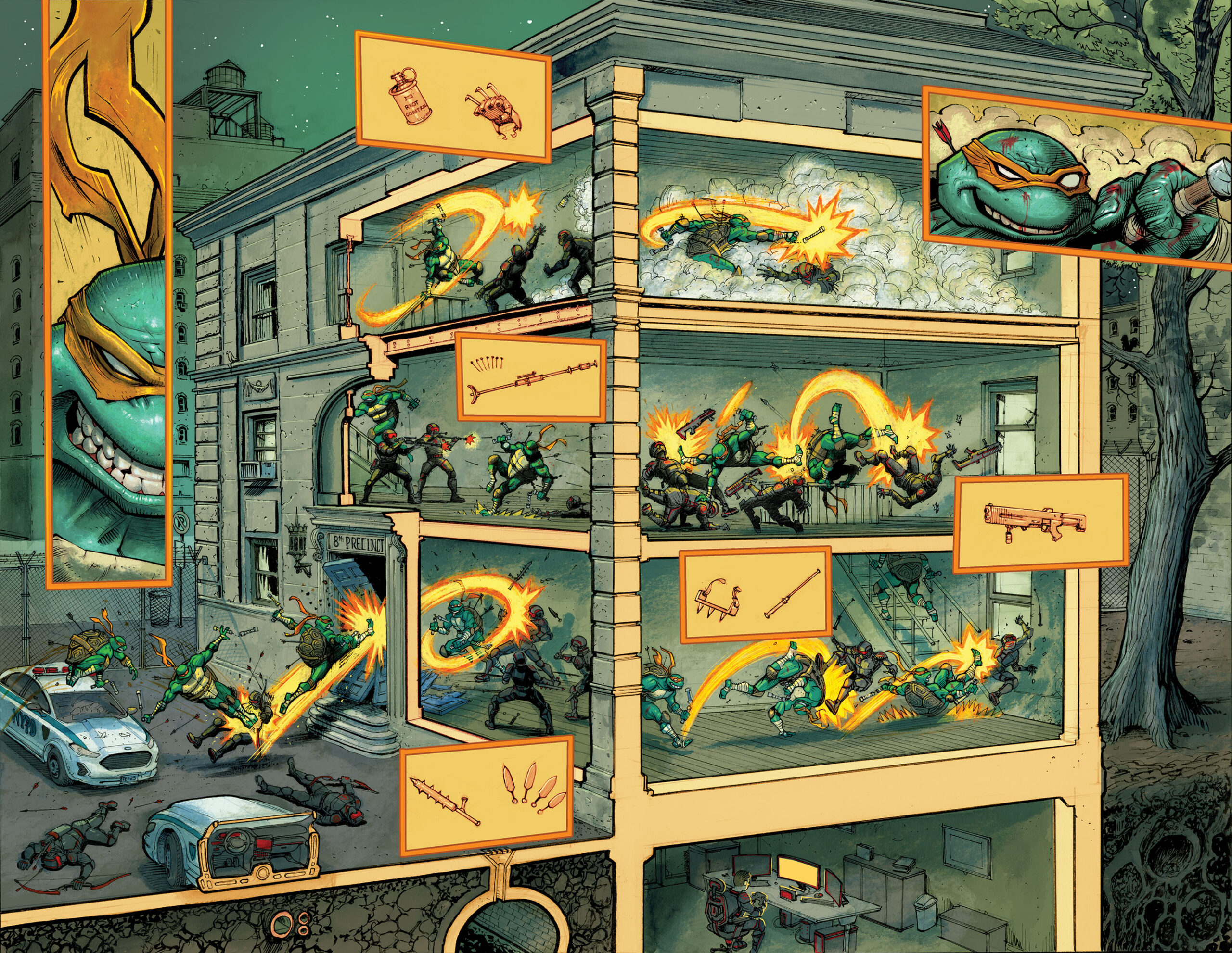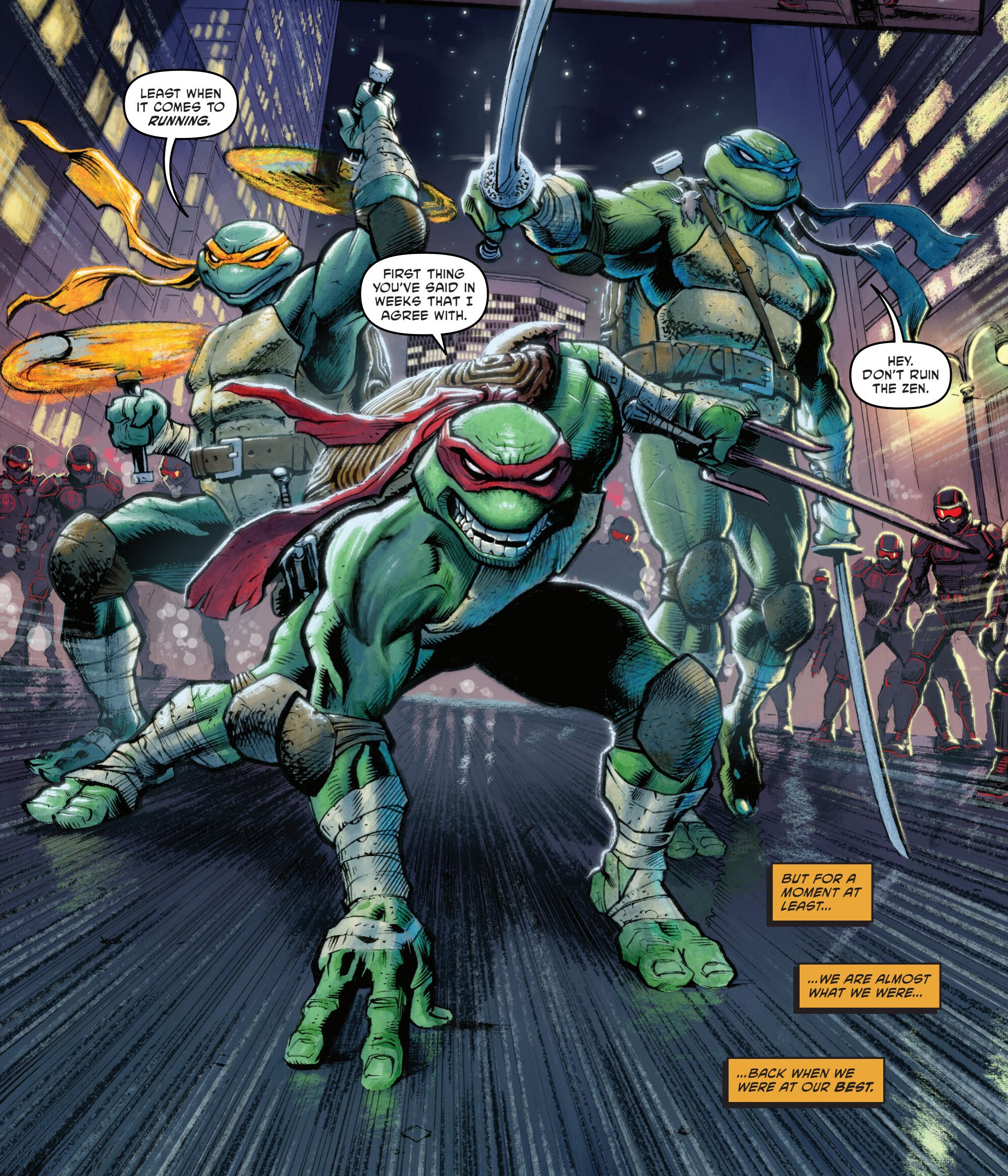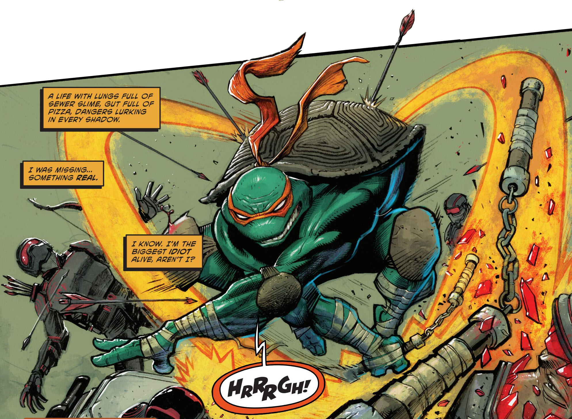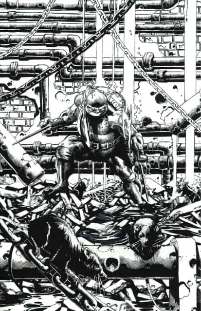 jetait dans la gueule du loup. Donatello avait été arrêté par le procureur de district Hieronymus Hale et il venait le délivrer. Il partait à l’assaut de la base connue du nouveau Foot Clan. Cette tension, ce risque, ces ennemis bien réels lui avaient manqués du temps du Japon (TMNT (Vol. 6) #2). La tortue se jouait de ses ennemis, sautant, dansant, esquivant et fondant sur les soldats pour les repousser et progresser dans la structure. Il essuyait de nombreux coups, des flèches et des shurikens étaient fichés dans sa carapace.