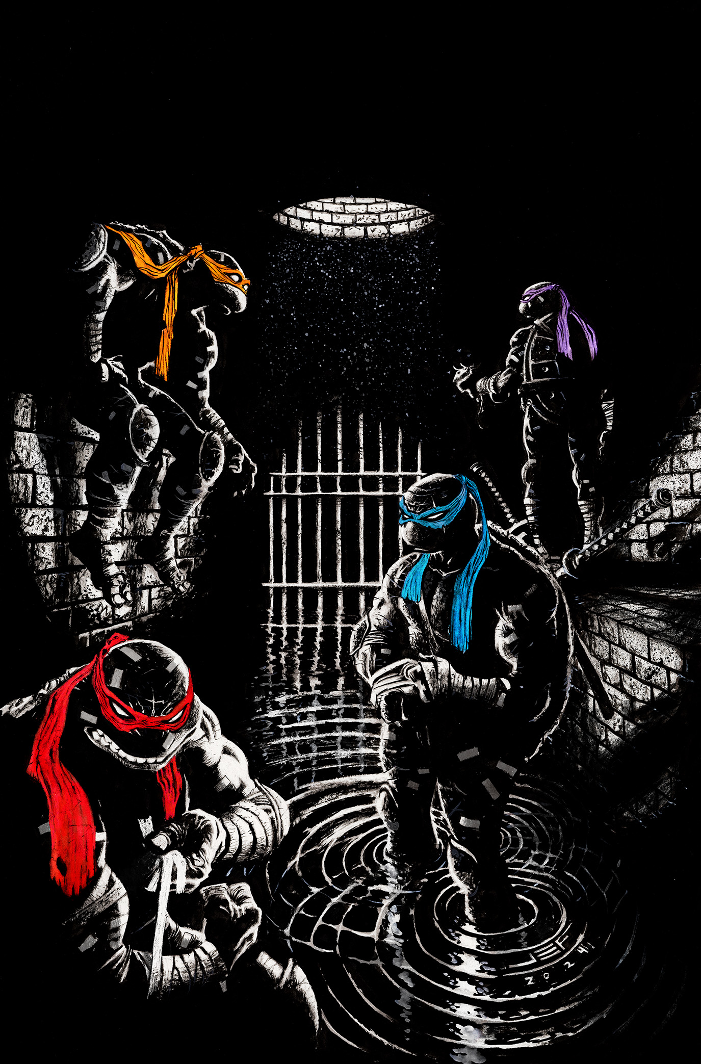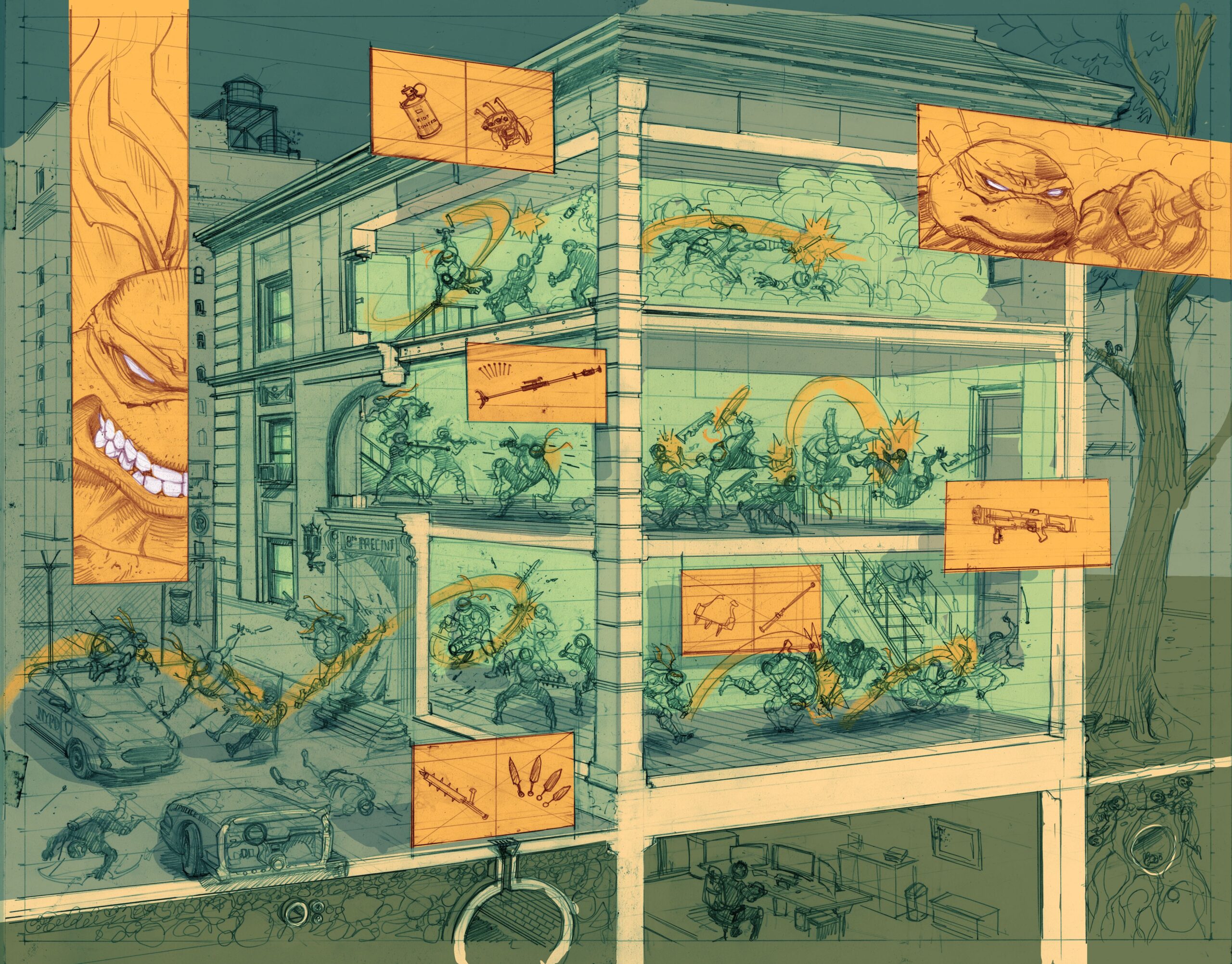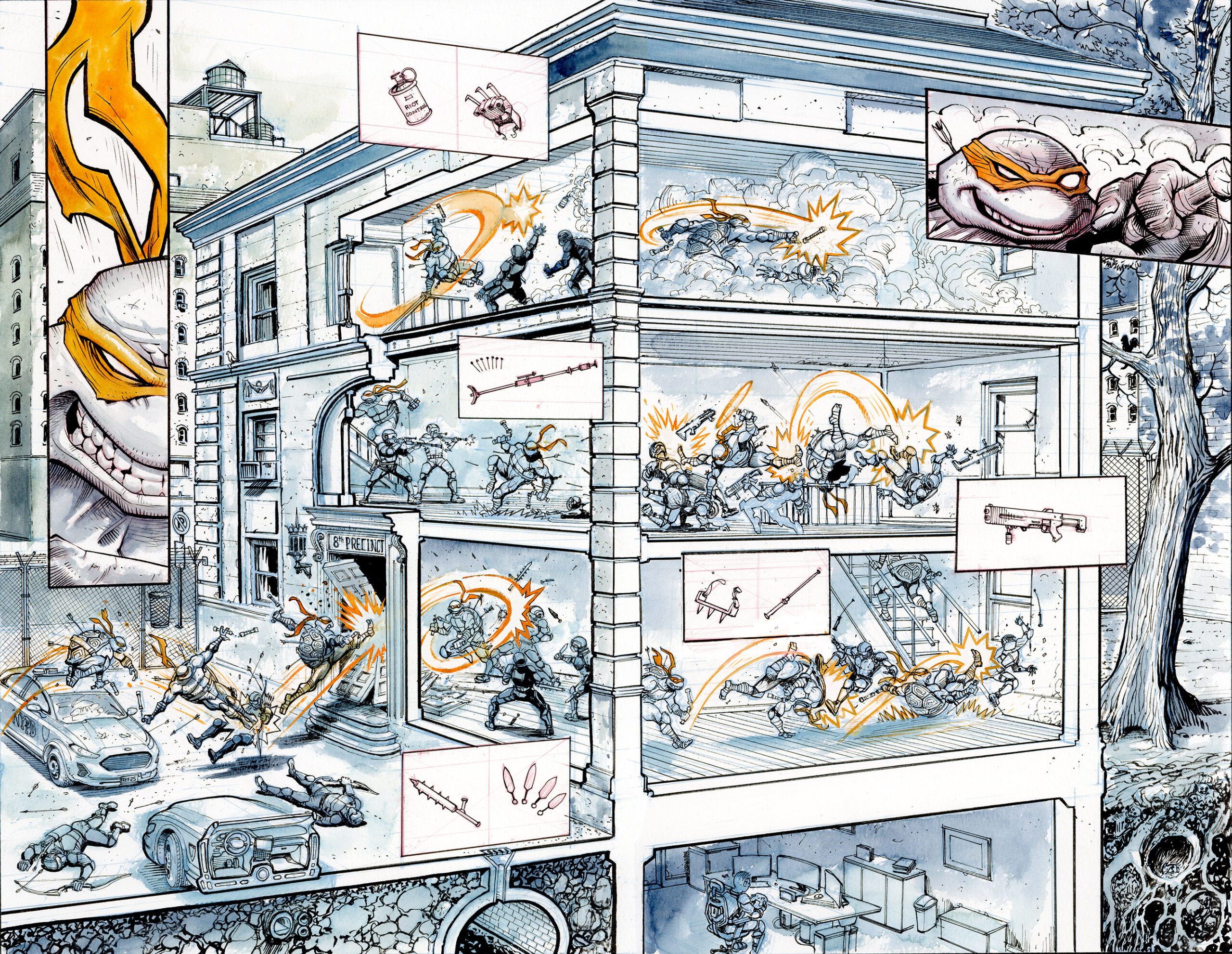 jetait dans la gueule du loup. Donatello avait été arrêté par le procureur de district Hieronymus Hale et il venait le délivrer. Il partait à l’assaut de la base connue du nouveau Foot Clan. Cette tension, ce risque, ces ennemis bien réels lui avaient manqués du temps du Japon (TMNT (Vol. 6) #2). La tortue se jouait de ses ennemis, sautant, dansant, esquivant et fondant sur les soldats pour les repousser et progresser dans la structure. Il essuyait de nombreux coups, des flèches et des shurikens étaient fichés dans sa carapace.