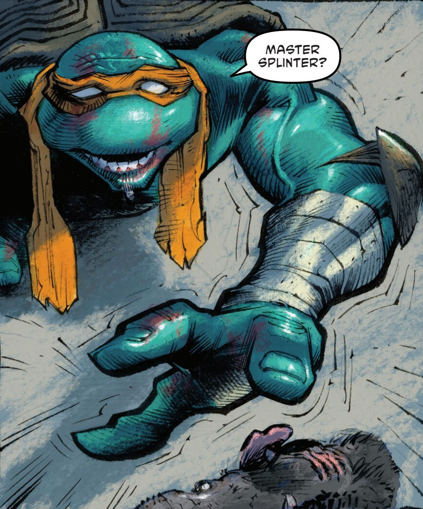 Les jours suivants, Michelangelo était décidé à corriger ses erreurs. Il errait dans les rues pour neutraliser les bandits qui arboraient des masques d’animaux pour terroriser les citoyens en faisant porter le chapeau aux mutants. Puis un soir, la tortue était rejointe par ses frères. Leonardo pensait que la tortue avait enfin entendue le message de Splinter et se joignait à leur cause, tout comme Donatello avant eux. Sans perdre de temps, et comme toujours, Michelangelo persistait à ne pas croire à cette histoire farfelue de rat mort – trônant sur l’épaule de Leonardo – qui était pris pour Splinter.