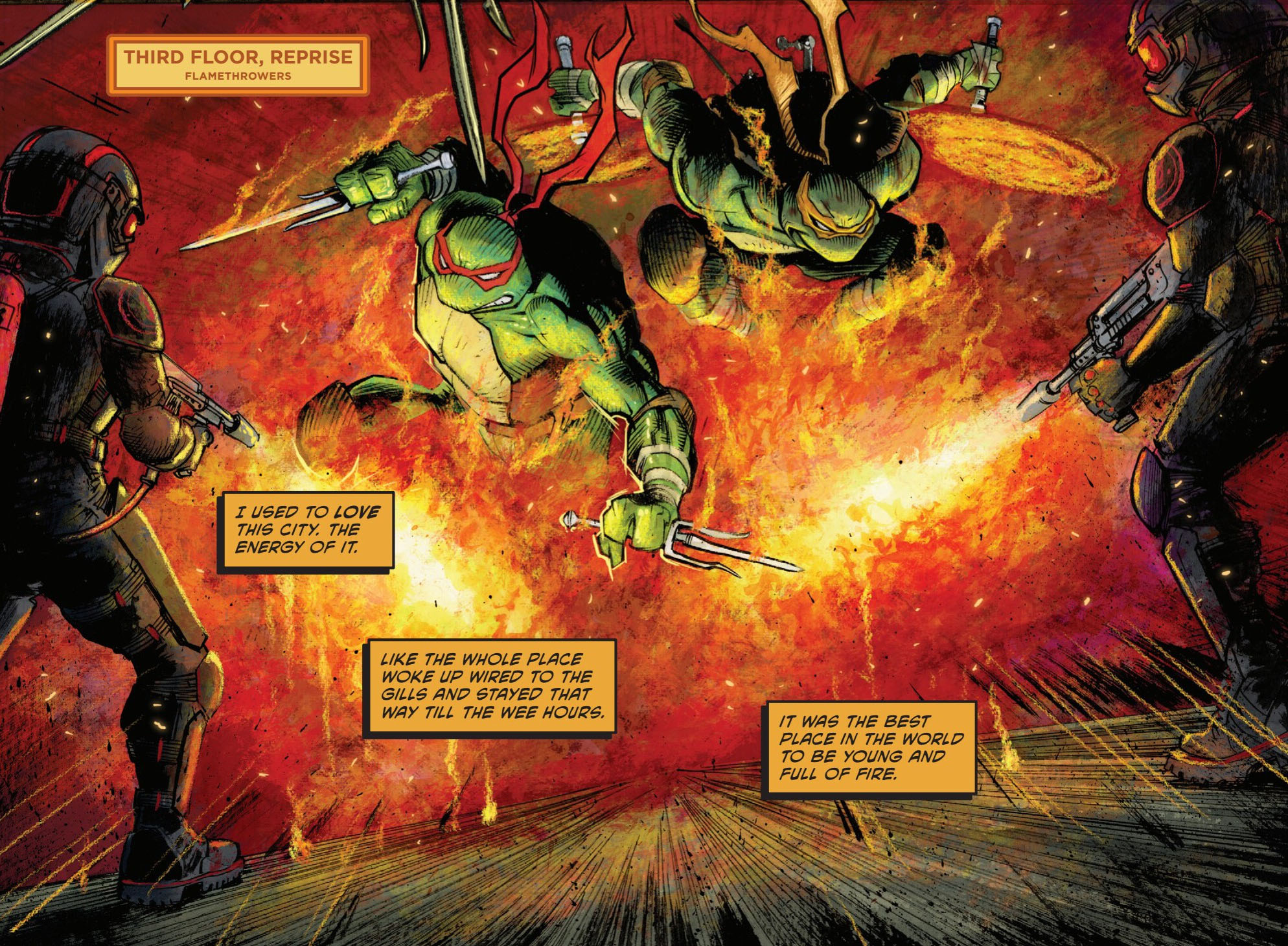 Soudain, une grille scellait l’ouverture, unique issue de ce bourbier. D’autres patrouilleurs Foot arrivaient, armes à feu à la main, pour tuer les tortues. Le boucan de Michelangelo mettait Raphael hors de lui. Une fois les deux frères écharpés, le combat pouvait reprendre. Les tortues fonçaient sur les soldats qui les accueillaient avec des lance-flammes…