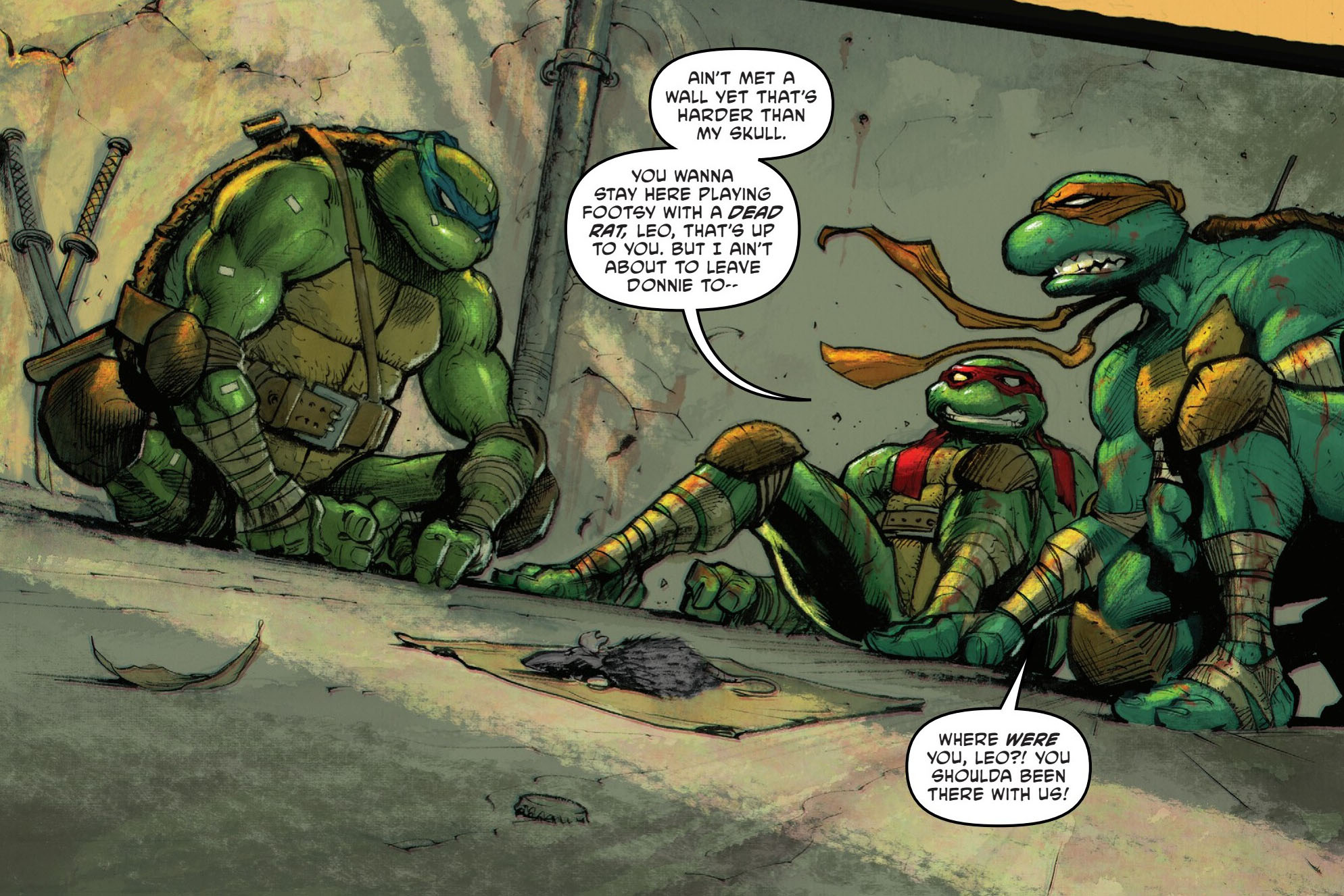 Une fois la bataille terminée, Raphael repartait avec son frère sur les épaules pour les égouts de Newark. Leonardo les y attendait, paisiblement assis devant la dépouille du rat que Donatello prenait pour Splinter. Le chef les avait prévenus, cela ne leur servirait à rien de continuer de cogner sans réfléchir. Ils feraient mieux d’écouter leur maître. Raphael ne pouvait entendre plus longtemps ces sornettes et coupait net son frère. Michelangelo en profitait pour reprocher à Leonardo son absence du combat. Ils devaient aider leur frère au plus vite.
