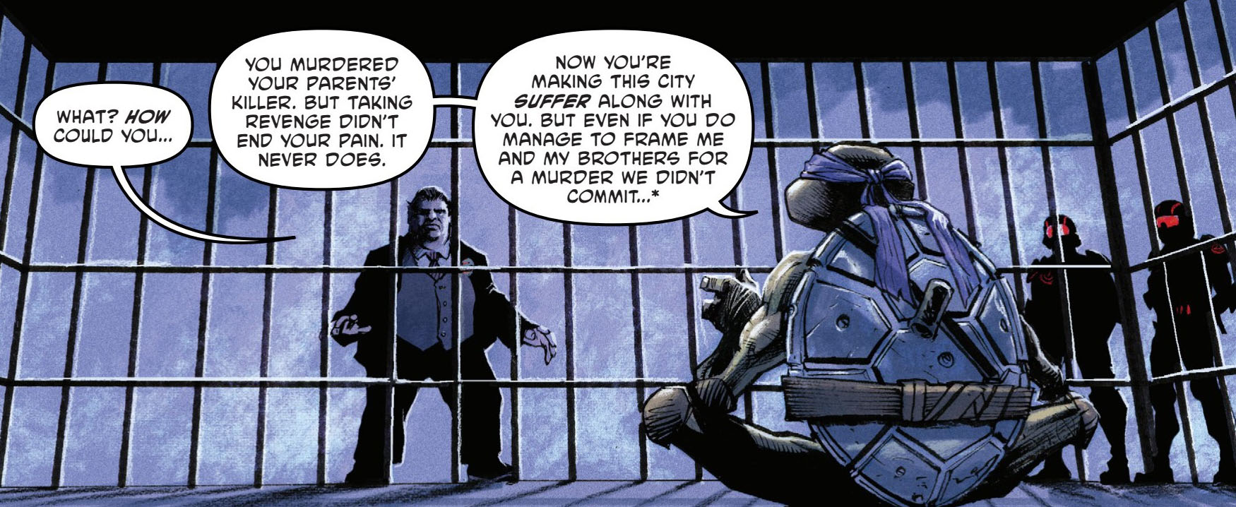 Donatello était enfermé dans une cage du zoo du Bronx. Il recevait la visite du procureur Hale, venu le menacer et le rabaisser. Monté sur ses grands chevaux, l’homme commençait par le casser moralement. Mais contre toute attente, la tortue retournait la situation dans la plus forte sérénité. En quelques instants, le mutant comprenait que la haine de Hale à son égard ainsi que celle de ses semblables venait de la perte de ses parents, qu’il avait lui-même vengé en tuant le mutant responsable de ce crime (TMNT (Vol. 6) #5. Mais cette vengeance en valait-elle la peine ? Hale se sentait-il mieux ? Il n’en était rien. Et il pouvait entraîner New York dans son deuil, condamner les tortues pour un meurtre qu’elles n’avaient pas commis (TMNT (Vol. 6) #1), sa peine ne changerait plus jamais. Déstabilisé, le procureur ne savait plus quoi répondre et s’en allait en vociférant.