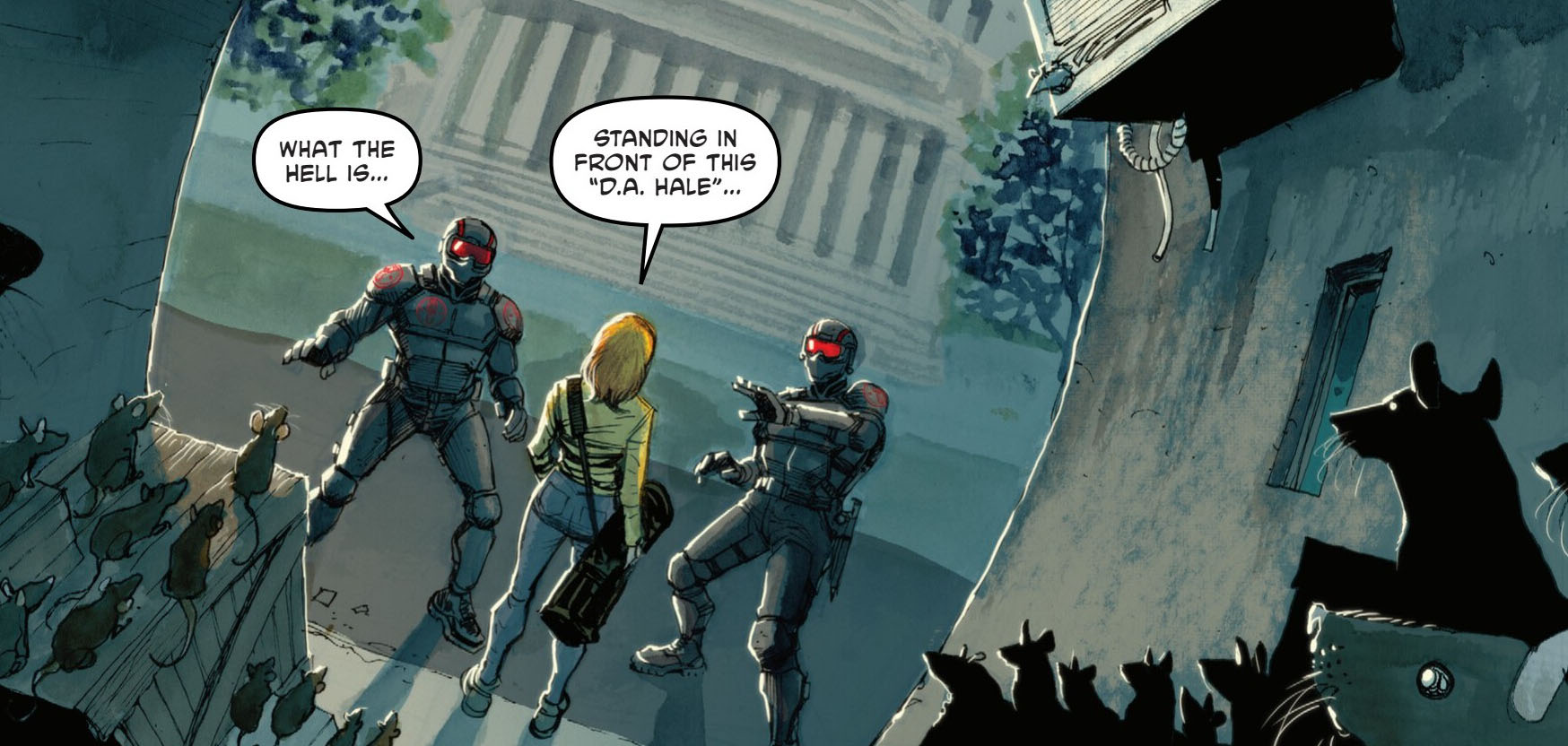 Pendant ce temps, April s’approchait du palais de justice. Elle tenait un sac de sport sur son côté, rempli des affaires de Casey et de son masque. La jeune femme se faisait appréhender par deux patrouilleurs Foot mais ne répondait nullement à ses questions. En jetant un œil dans la ruelle derrière elle, les soldats apercevaient une nuée de rats. Les rongeurs sautaient sur les deux hommes tandis que l’amie des tortues partait s’entretenir avec Hieronymus Hale.