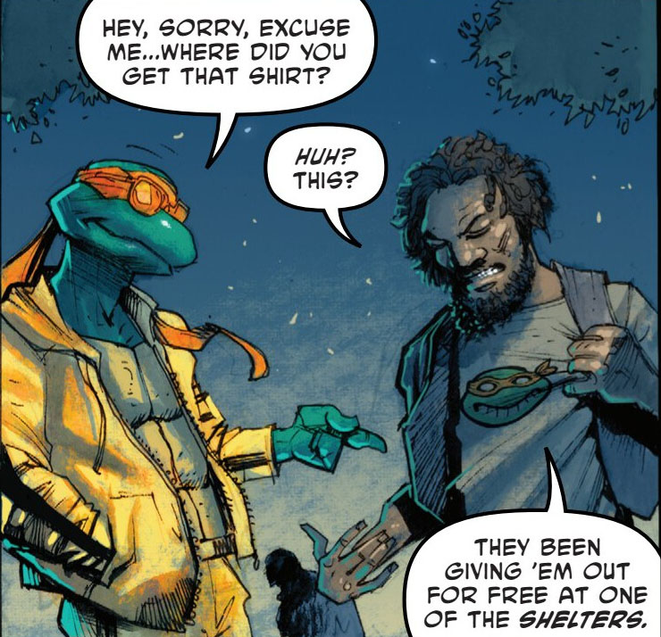 Arrivés dans la rue, le mutant continuait de parler avec cet étrange homme, qui l’invitait à lui montrer où il avait découvert ce t-shirt à son effigie. Après quelques minutes de marche, ils arrivaient à Haleville. Le nouveau procureur était ce qui était arrivé de pire à New York depuis l’élection de Stockman (TMNT (Vol. 5) #98). Plus de violence, plus de pauvreté et des types déguisés en mutants qui ne cessaient de semer le chaos. À Haleville, un bidonville installé dans un parc, toutes les personnes arboraient ce vêtement à l’effigie de Michelangelo. La tortue était très surprise de voir autant de fans de sa série. Il se rendait vite compte qu’en réalité, ces pauvres personnes n’avaient jamais entendues parler de cette série. Ils supposaient même que ce devait être une émission annulée ; ces vêtements leurs avaient été offerts dans un refuge ! Soudain, Michelangelo se mettait à rire aux éclats. Tout devenait très clair à ses yeux. Voilà des mois qu’il s’était déconnecté des choses essentielles. Qu’il avait perdu le fil et ne voyait plus les vrais problèmes. Ces personnes n’étaient pas des fans, ils ne savaient même pas de quoi il s’agissait. Ils voulaient simplement vivre !