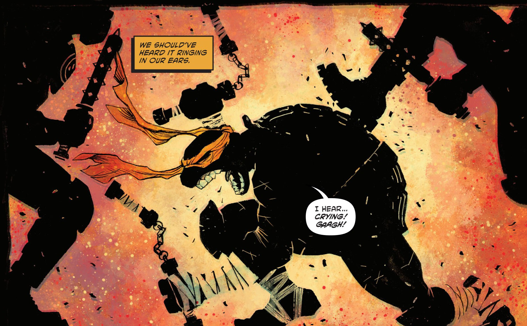 Au même moment, la rue se teintait de bleu et de rouge, des voitures de police arrivaient et des Foot patrols déferlaient vers les trois mutants qui sortaient leurs armes en réponse. Un combat s’engageait. Le premier où les morceaux semblaient commencer à se recoller entre les frères. Tout n’était pas rose. Ils n’étaient pas réconciliés. Mais voici une éternité qu’ils ne s’étaient pas battus de la sorte. Il en faudrait plus pour venir à bout des soldats, qui finissaient par avoir raison des trois mutants. Mais alors qu’il se faisait molester, Michelangelo entendit un pleur. Ce n’étaient ni Raphael, ni Leonardo. Relevant la tête alors que son lourd corps venait de s’écrouler au sol, le reptile voyait le cadavre du rat en décomposition avancée.