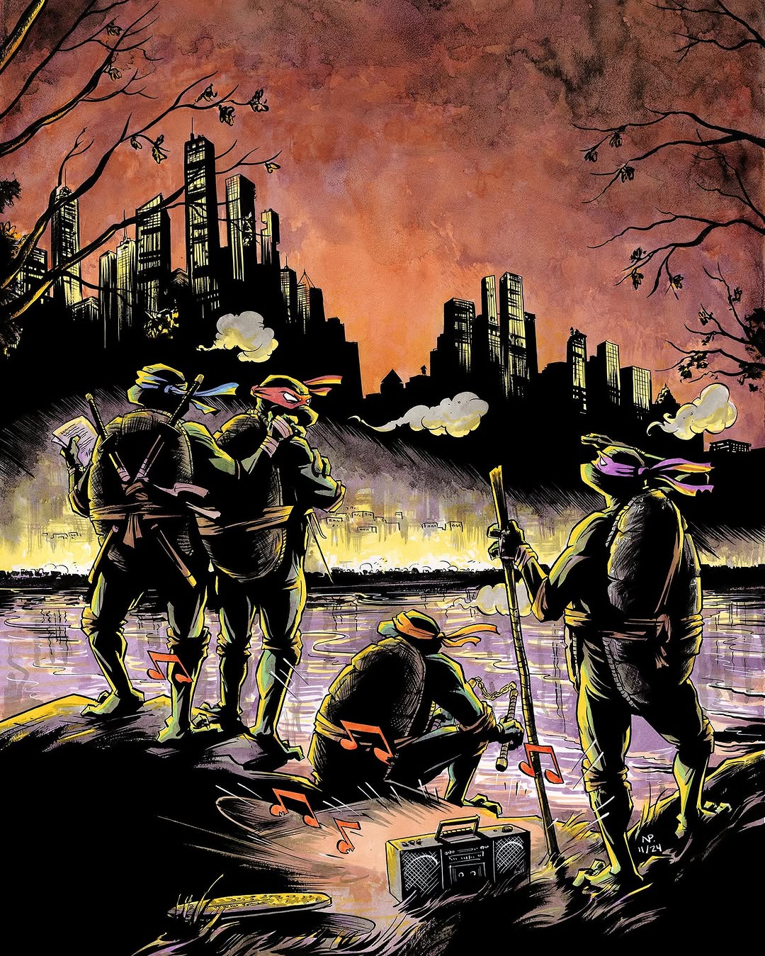 Au tribunal, le juge donnait la parole à la défense après des témoignages accablants. Les tortues se tenaient debout face à lui, les mains données. Elles ne disaient pas un mot et semblaient comme prier. Soudain, la porte de la salle s’ouvrait et des dizaines de manifestants entraient avec des pancartes. Ils s’opposaient à la condamnation des quatre frères. Ce n’étaient pas eux qui semaient la pagaille dans la ville depuis trop longtemps. Ils accusaient au contraire les Foot patrols de Hieronymus Hale, sans merci, s’adonnant volontiers à du racket et aux menaces. Le juge ordonnait que l’on fasse sortir ces perturbateurs. C’est alors que Donatello se tint face à lui, et lui annonça poliment que la défense était prête à témoigner.
