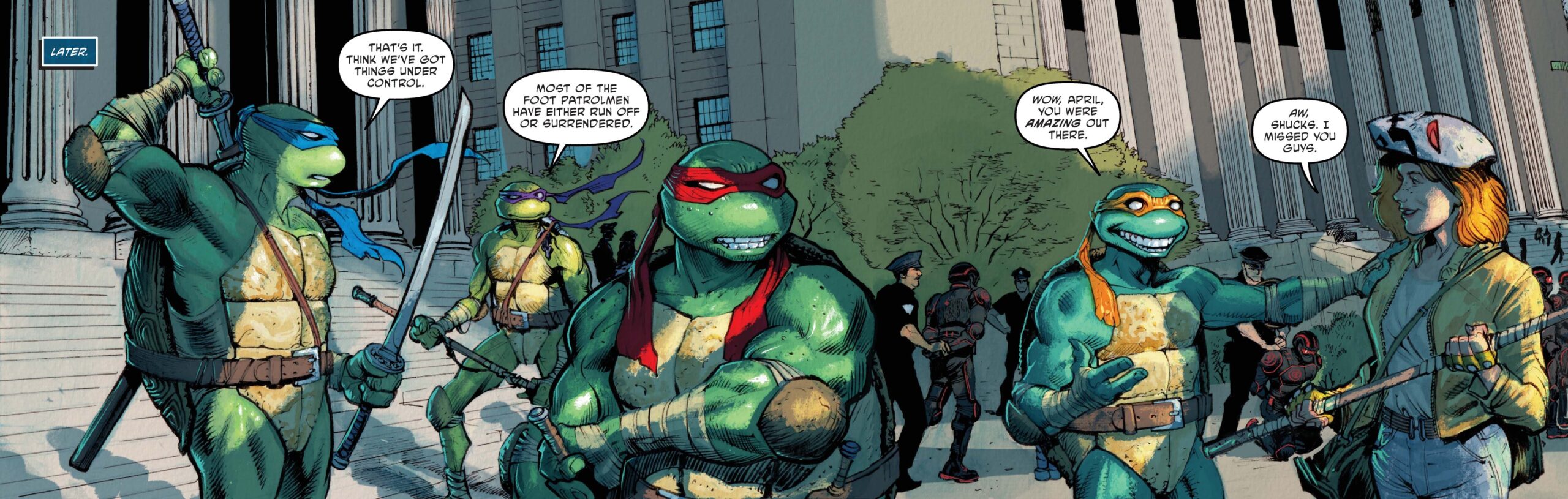 Devant le tribunal, les derniers patrouilleurs étaient appréhendés par la police, tandis que les autres avaient fuis. April retrouvait enfin les tortues et leur annonçait que Casey était sorti du coma. Une excellente nouvelle pour clôturer cette aventure de fou. Les tortues s’asseyaient sur les marches pour souffler et discuter avec leur amie.