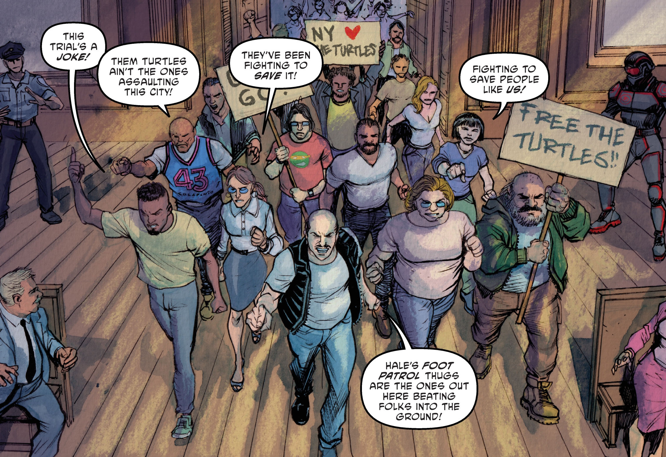 Le premier homme entendu évoquait une anecdote des plus embarrassantes pour les patrouilleurs Foot. Alors que sa boutique était en train de se faire voler par ces forces de l’ordre, l’une des tortues était intervenue pour le défendre (TMNT (Vol. 6) #7) ! À la suite arrivaient trois jeunes qui affirmaient avoir été payés par Hale pour revêtir des costumes d’animaux pour commettre des crimes et accuser les mutants. Ils s’étaient fait balayer par l’un des quatres reptiles dans le métro (TMNT (Vol. 6) #9). Le suivant évoquait l’une des tortues qui avait pris la défense des animaux de sa boutique, qui se faisaient massacrer sans raison (TMNT (Vol. 6) #7). Le dernier était l’homme au t-shirt de tortues, qui évoquait la protection de Michelangelo et de ses frères (TMNT (Vol. 6) #9).