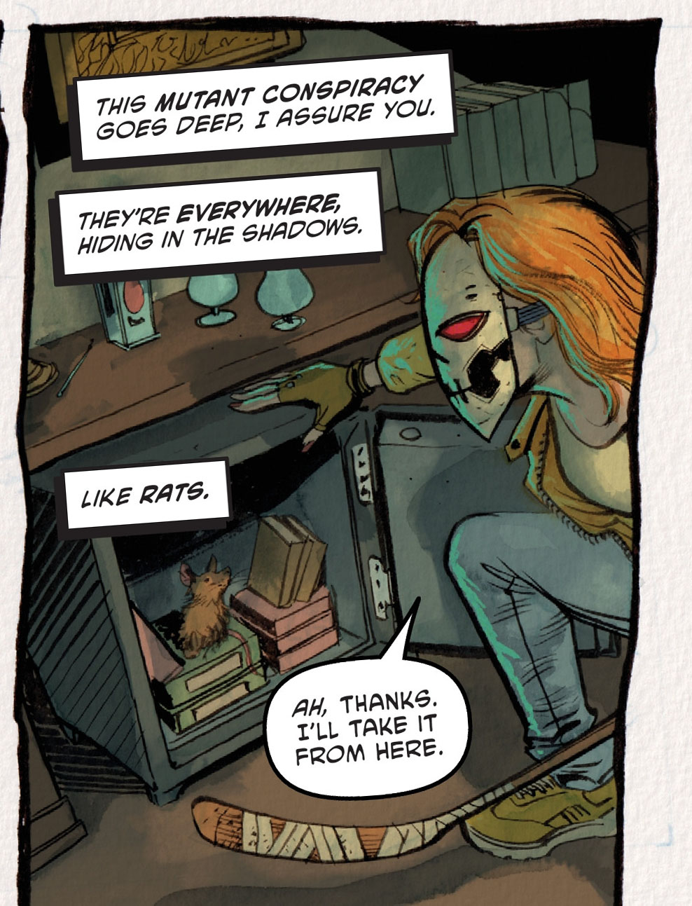 Face à lui se tenaient Bebop et Rocksteady, qui avaient bien l’intention de lui faire passer un sale quart d’heure. Après tout, il avait monté l’opinion contre les mutants depuis de nombreux mois… Ils l’invitaient à pousser la porte pour parler à leur cheffe. Attention à ne pas trébucher dans les os de ceux qui avaient osés la déranger !