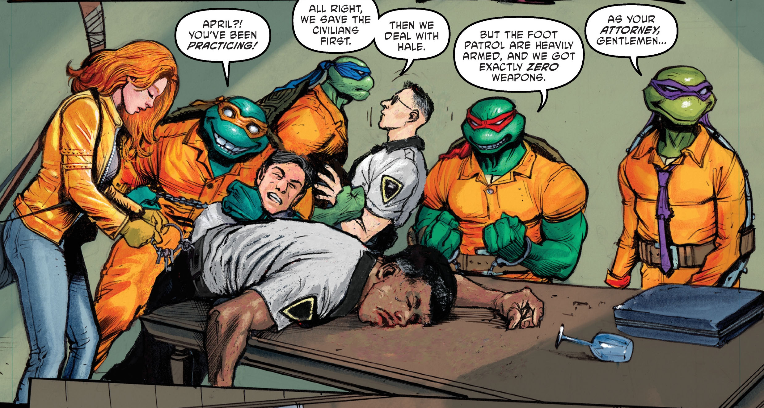 Face à toutes ces preuves qui s’accumulaient, le juge ne savait plus où donner de la tête. La foule clamait la tête du procureur. Ce dernier ne savait plus où se mettre. Tous les arguments étaient bons pour se sortir de là. Après tout, ces preuves avaient été obtenues illégalement ! Face au retournement de situation, le procureur ordonnait à ses patrouilleurs de l’aider à sortir de là. Dans la violence qui les caractérisait si bien, ces forces de l’ordre molestaient les manifestants pour éclairer la route à travers le tribunal. Pendant ce temps, les trois assassins dissimulés en policiers fondaient sur April pour se venger. La jeune femme fracassait la mâchoire de l’un à l’aide de sa crosse de hockey. Les tortues s’interposaient tandis que leur amie prenait les clés des menottes pour libérer ses amis. Avant de filer, les quatre frères ramassaient quelques pièces à convictions qui reposaient sur une table de la pièce ; leurs armes !