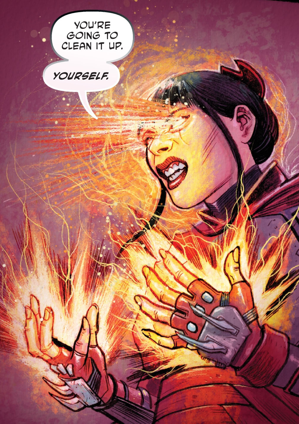 Le procureur se relevait et prenait la fuite. Toujours persuadé d’avoir agi dans l’intérêt de la ville, il expliquait à Karai qu’il acceptait sa position de lâche. Après tout, c’était ainsi qu’étaient traités les plus grands bienfaiteurs de l’histoire. D’éternels incompris de leur époque selon lui. Ces explications rendaient la cheffe du Foot Clan hors d’elle. Si Hale avait été engagé, c’était pour distraire les tortues, les tenir éloignées de ses desseins. Le résultat était encore pire, puisqu’elles avaient été élevées au rang de martyrs. Le feu sortait de ses yeux. Furieuse qu’il ait bafoué l’honneur de son clan, les flammes entouraient son corps qui se mettait à léviter. Voilà des semaines qu’elle s’était enfermée là pour canaliser le démon qui se trouvait en son sein. Elle enveloppait Hale de ces flammes, qui la suppliait de l’épargner. Le visage de Karai laissait place à celui du Traveler. Au même moment, le corps tout entier du procureur se transformait à son tour en un mélange de créatures grotesques.