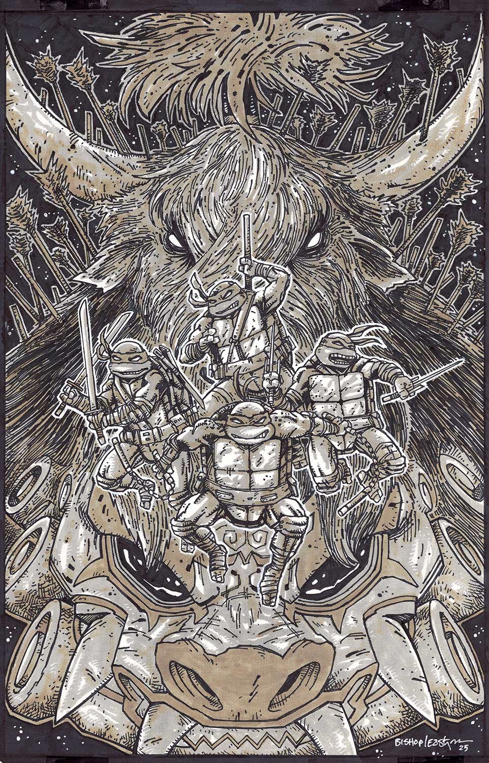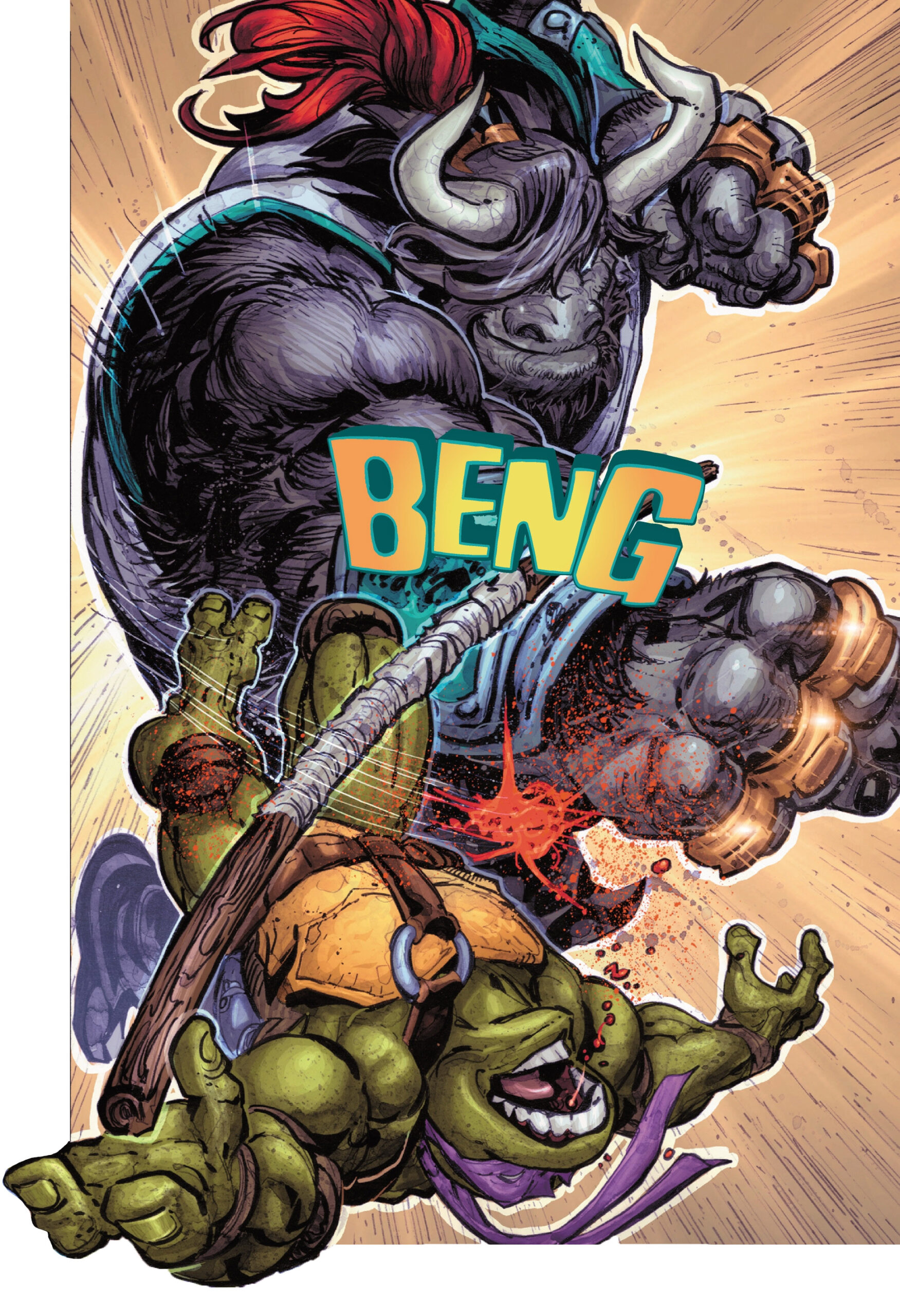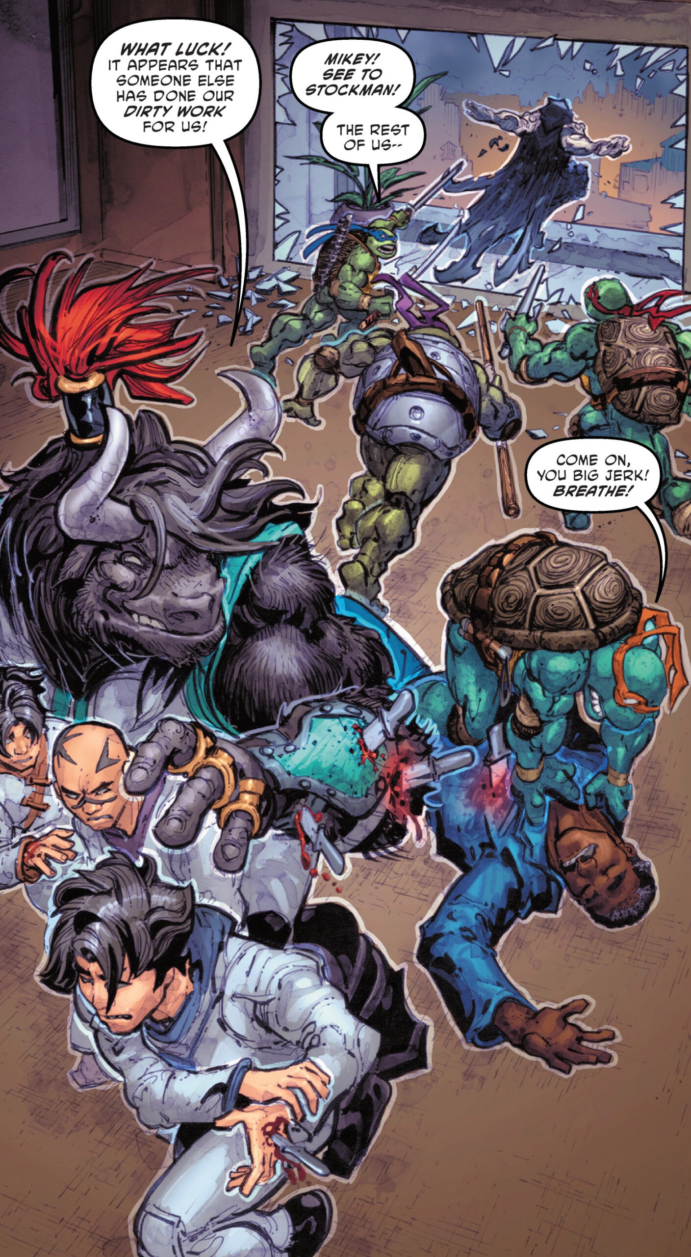 Donatello bondissait et de son bâton éloignait le mutant de Baxter. Il s’agissait du buffle qu’il avait vu plus tôt dans la journée sur le pont, Papa Beng. La bataille pour laquelle ils s’étaient interposés était un rite initiatique pour qu’il choisisse ses nouveaux lieutenants. Trois d’entre eux avaient été sélectionnés ainsi et se trouvait dans cette pièce. Les autres tortues avaient fort à faire face à ces guerriers expérimentés. Le mutant à cornes s’apprêtait à passer