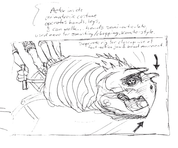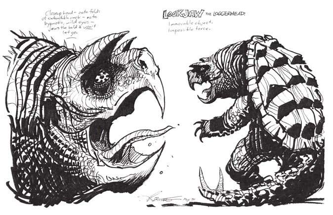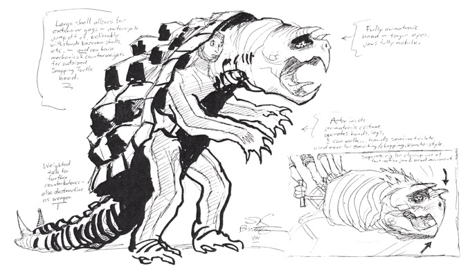 Le hasard faisant bien les choses, Bissette avait été approché peu de temps après grâce à son ami Ryan Brown pour travailler sur un monstre de film à petit budget. Un monstre qui serait réalisé en animatronique, et dont nous avons une idée de son fonctionnement à travers les concept arts ci-dessous. C’était l’occasion pour l’artiste de poursuivre son travail sur Terrorpin. Bissette présentait alors une tortue du nom de Lockjaw the Loggerhead. S’il s’agissait d’une tortue caouane (loggerhead en anglais), force est de constater que son apparence renvoie bien plus à une tortue serpentine. Le film, qui devait être tourné dans l’Ohio, n’a jamais vu le jour. Cependant, l’artiste avait proposé des concept arts très intéressants, datés de mai 1990, soit un mois après la réalisation du dessin de Terrorpin, qui n’avait pas été retenu ! (source).