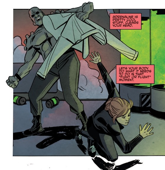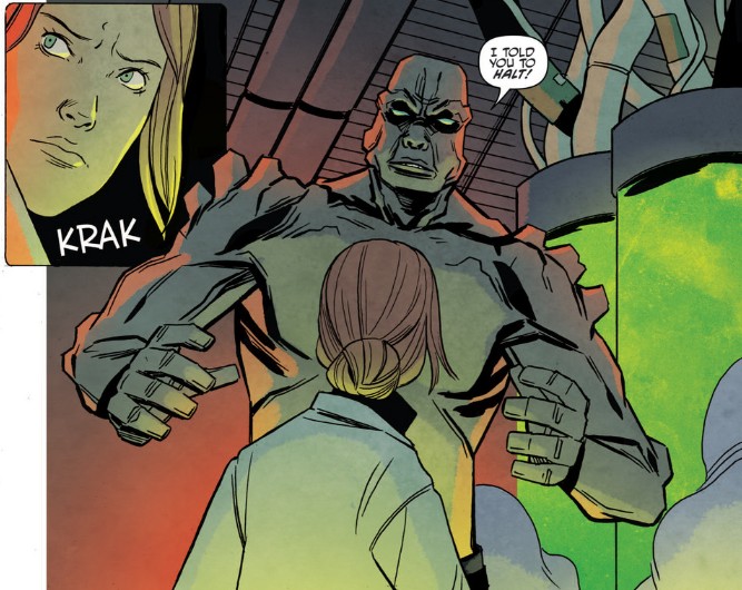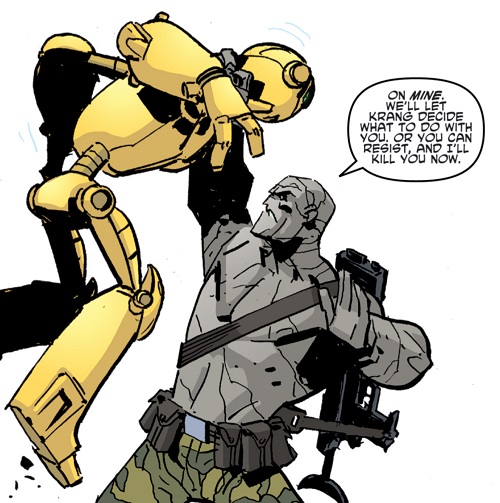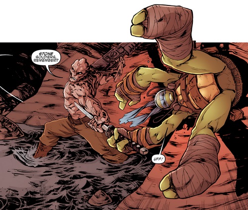 Lorsque Michelangelo arriva, les tortues vinrent en aide aux deux soldats dont Tragg gravement blessé et inconscient (TMNT #58).