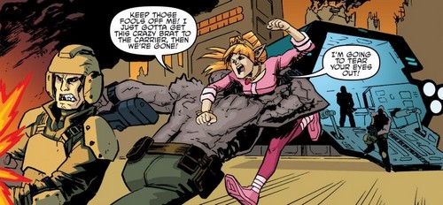 Il devenait crucial de libérer la famille royale. Krang proposait d’échanger le roi et la reine contre le professeur Honeycutt. Si le scientifique était en mesure de renverser le cours de la guerre, Krang aurait fait un double coup en l’empêchant de lui nuire et l’aider à terminer son Technodrome. La princesse Trib voulut partir sauver ses parents, aux côtés de Dask et des tortues. Loin d’être le cliché d’une princesse niaise et précieuse, elle possédait une tenue de combat et était une redoutable tireuse (TMNT #19). Elle se rendit avec les soldats au palais royal et se montra d’une très grande aide au cours du combat contre le général. Mise à couvert par Dask et Kala dans un premier temps, elle appuya leurs attaques avec ses tirs, faisant tomber de nombreux soldats de pierre. Elle détruisit même le bras droit du corps androïde de Krang, alors qu’il allait tuer Leonardo. Une fois le combat terminé, elle embrassa Michelangelo sur la joue pour lui dire adieu (TMNT #20).