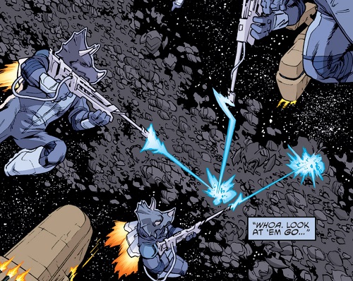 De nature guerrière, les triceratons défendirent les plages de l’île, jusqu’au complexe central. Une très grande partie périt sous le feu de l’Earth Protection Force (TMNT #86) jusqu’à l’arrivée de Ch’Rell (TMNT #87) et de Sally Pride, qui mirent en déroute les forces de Bishop (TMNT #88).