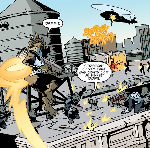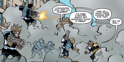 es triceratons firent bientôt face à une nouvelle guerre. Stockman, menacé par John Bishop, lui révéla où se trouvaient les dinosaures mutants. L’homme lança très rapidement une offensive sur l’île. Avec peu de temps pour se préparer, utroms et triceratons durent faire face à une armée entière.