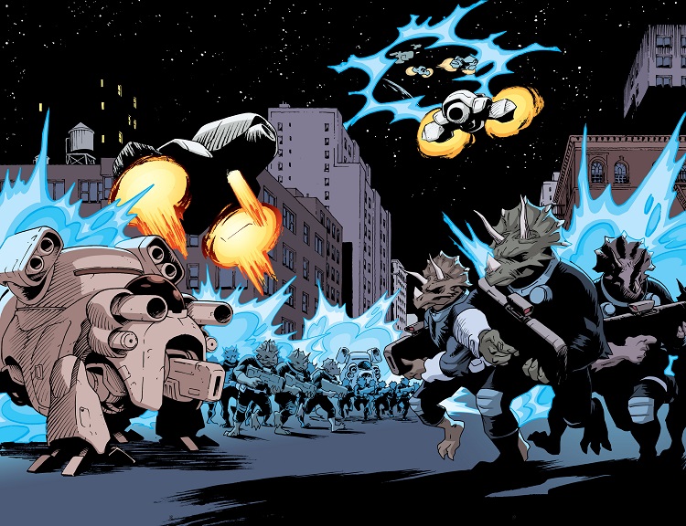 Les tortues comprirent que leurs amis avaient été attaqués par l’Earth Protection Force, pire encore, Splinter avait fait une alliance avec eux (TMNT #78). Pendant que les troupes se déployaient dans la ville, Zom établit un quartier général de fortune dans une église. Le plan de Splinter était de les occuper dans la ville à travers les forces fédérales de Bishop, tandis qu’il attaquerait avec sa garde d’élite le centre de commandement terrestre de l’invasion. Les tortues apprirent la nouvelle et se rendirent sur le lieu pour aider leurs amis à cornes (TMNT #79). Les soldats triceratons furent vaincus par le Foot Clan. Donatello avait un plan et ses frères et lui, ainsi que Zom furent téléportés dans le laboratoire de Baxter Stockman. Les utroms étaient d’accord pour accueillir ce qu’il restait des troupes triceratons sur Burnow Island. Les derniers soldats triceratons furent alors tous envoyés en cachette sur l’île (TMNT #80).