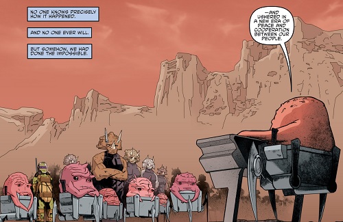 La venue des triceratons sur l’île ne fut pas de tout repos, ni pour eux, ni pour les utroms. Les querelles millénaires avaient beaucoup trop rongé les esprits des deux espèces, raison pour laquelle Ma’Riell et Zom décidèrent de faire appel à Donatello pour les aider à créer un accord entre les deux peuples (TMNT Universe #21). Après bien des hauts et des bas, ils trouvèrent finalement un point d’entente. Triceratons et utroms purent signer l’accord et entamer un processus de cohabitation sur Burnow Island (TMNT Universe #22).