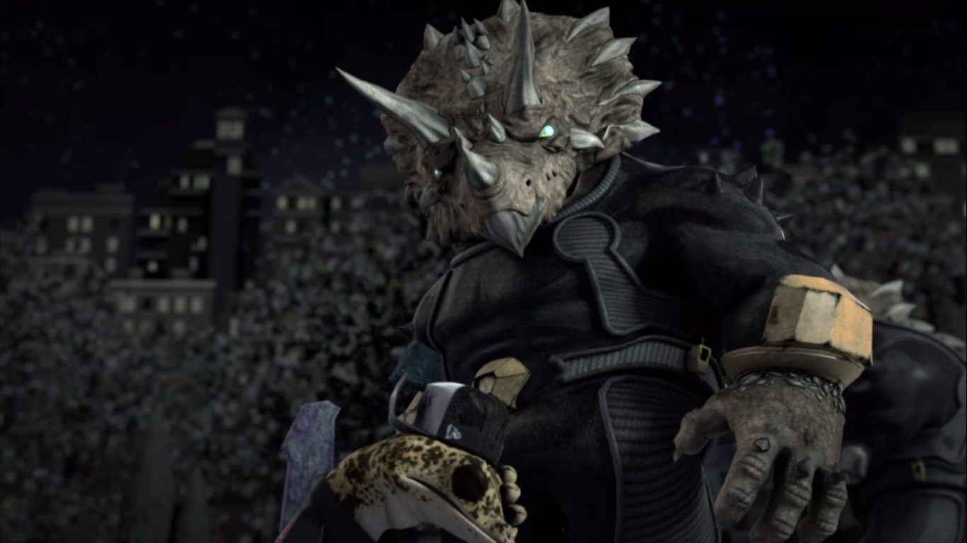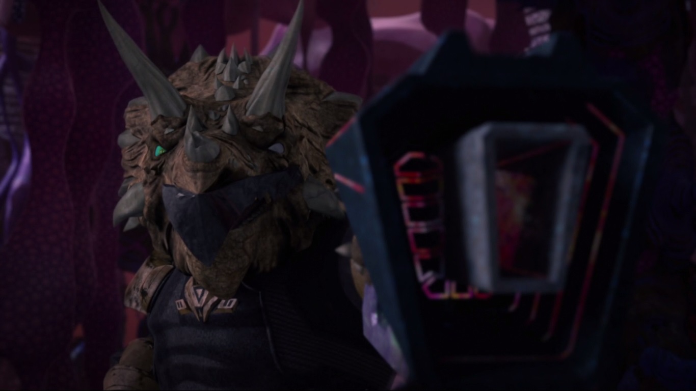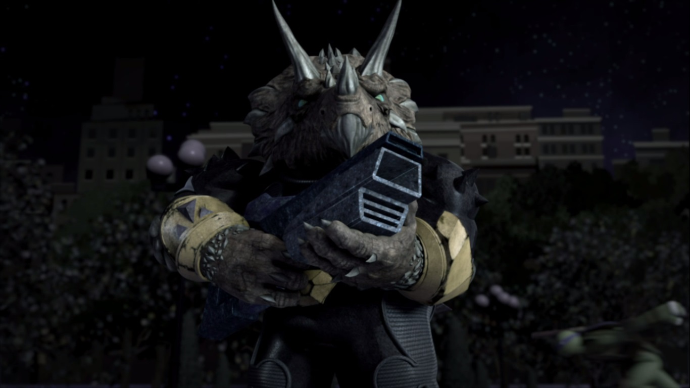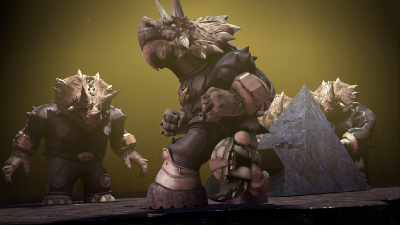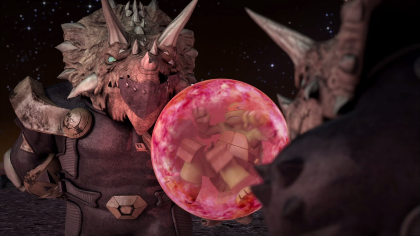 Après la destruction de leur planète par les kraangs, qui utilisèrent le générateur de trou noir, les derniers survivants se replièrent dans des rochers, derniers vestiges de leur monde en lambeaux, transformés en vaisseaux. Les triceratons jurèrent vengeance et veillèrent à éradiquer les kraangs de la galaxie à n’importe quel prix (Au-delà des frontières de l’espace, S4 E1).