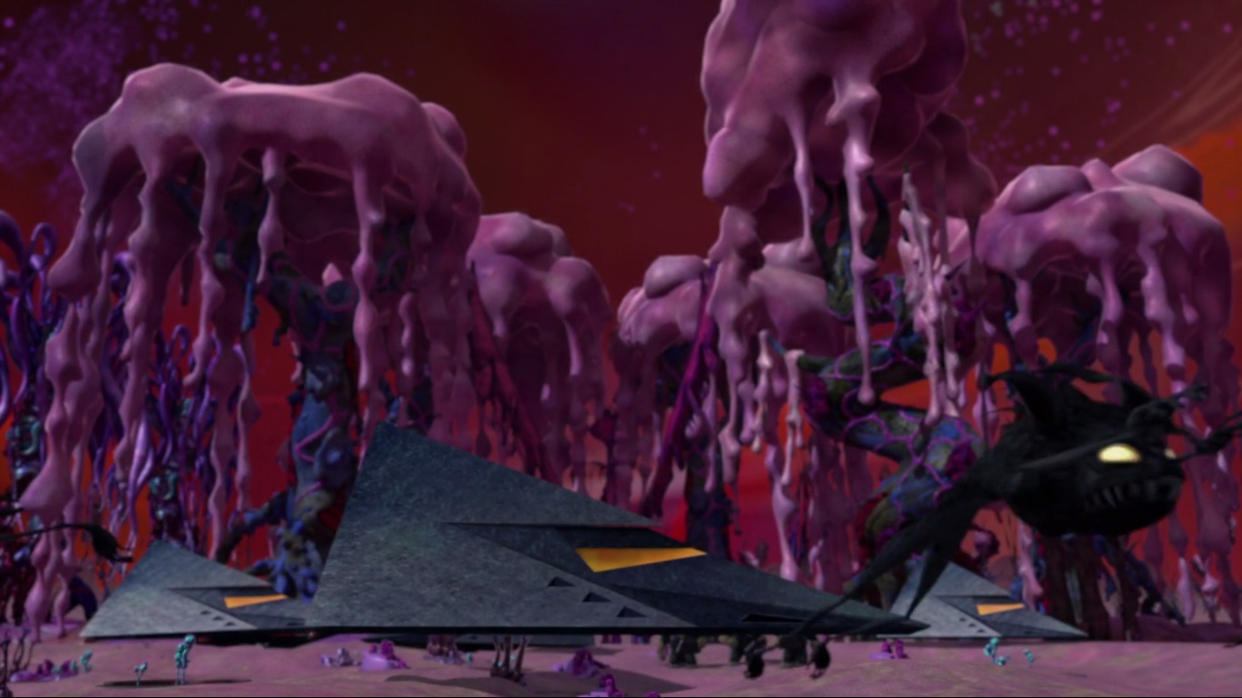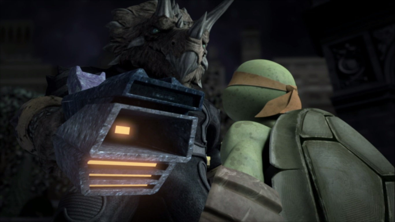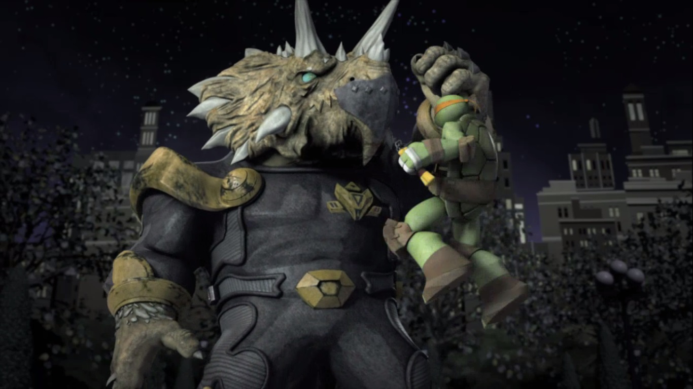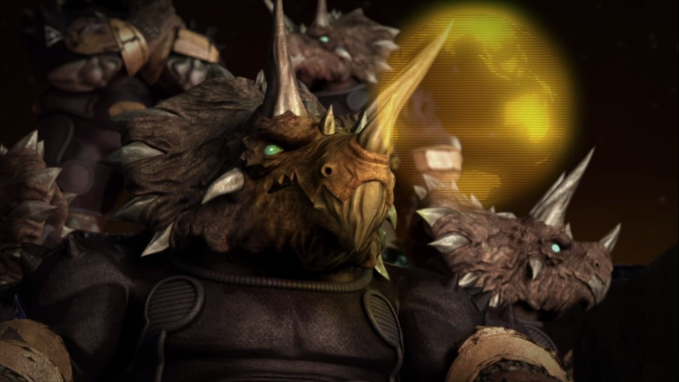 Après la destruction de leur planète par les kraangs, qui utilisèrent le générateur de trou noir, les derniers survivants se replièrent dans des rochers, derniers vestiges de leur monde en lambeaux, transformés en vaisseaux. Les triceratons jurèrent vengeance et veillèrent à éradiquer les kraangs de la galaxie à n’importe quel prix (Au-delà des frontières de l’espace, S4 E1).