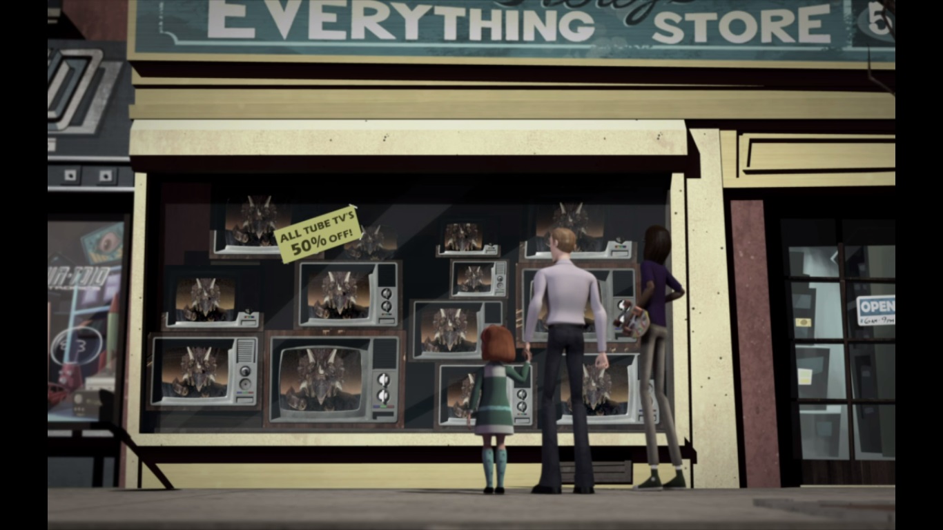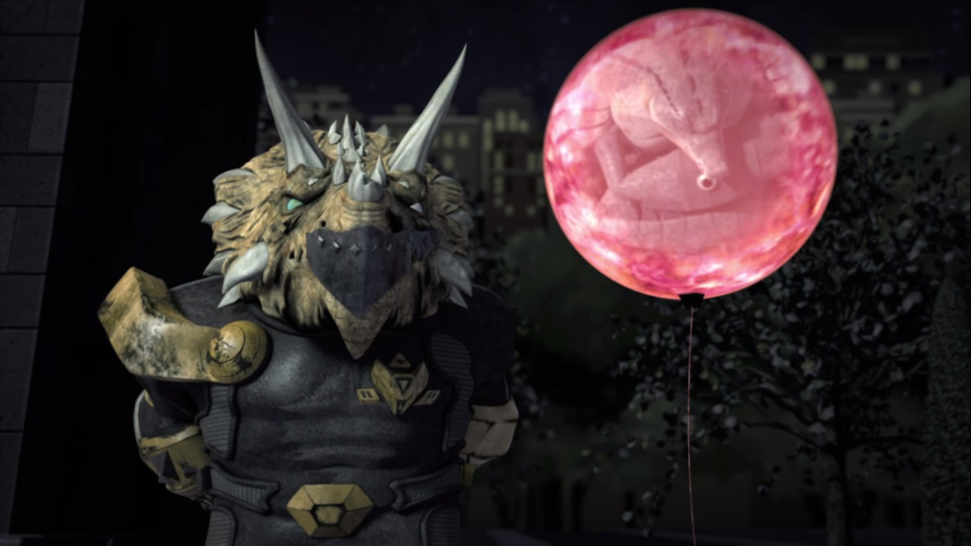 - Dans l’épisode L’invasion, part. 2 (S2 E26), un morceau de journal volant passe devant l’écran brièvement, où il est marqué qu’un homme à l’apparence d’un tricératops avait été aperçu.