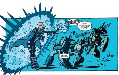 C’est alors qu’une lueur bleutée apparut devant les tortues. C’était Renet, rassurée d’avoir enfin retrouvé leurs traces. Les tortues savaient plus ou moins pourquoi elles étaient là, mais il semblait y avoir un problème avec son sceptre du temps. La maîtresse du temps ne parvenait pas à s’exprimer clairement à cause d’une anomalie et partait aussi vite qu’elle était arrivée pour trouver un réparateur.