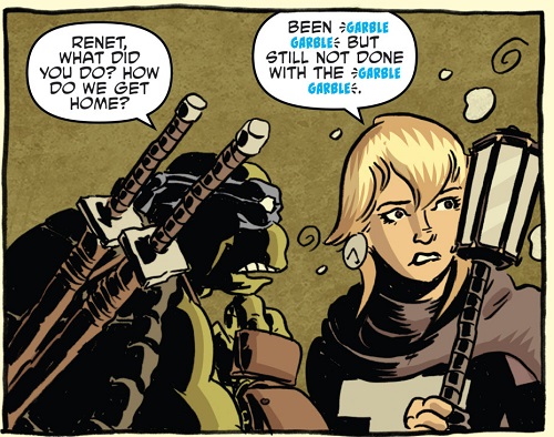 En un éclair, les tortues se trouvaient de nouveau transportées ailleurs. Inspectant les alentours d’une forêt, Donatello pensait d’après la flore et du relief qu’il s’agissait du Japon. Leonardo apercevait des traces de roues au sol. Alors que le scientifique se creusait la tête pour comprendre pourquoi ils voyageaient non pas uniquement dans le temps, mais aussi à différents lieux sur Terre, Renet faisait de nouveau son apparition. Tout comme la fois précédente, l’apprentie maîtresse du temps tentait de communiquer avec les tortues mais la plupart de ses mots demeuraient incompris. Aussi vite qu’elle était apparu, elle s’évaporait de nouveau.