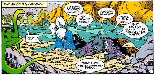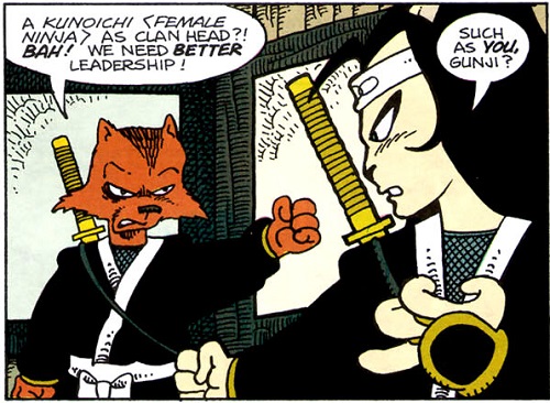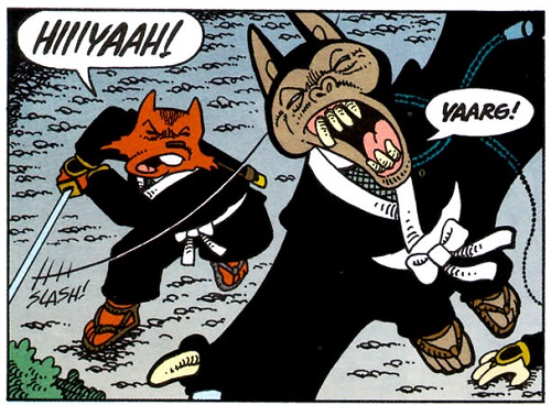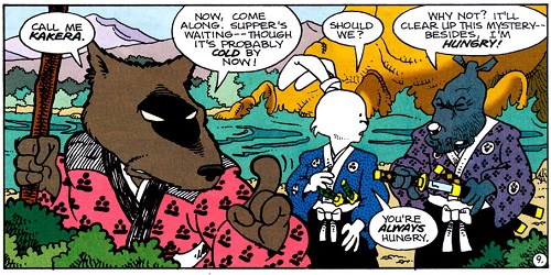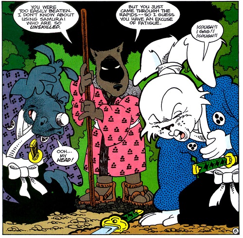 Après quelques kilomètres à la dérive, les deux compagnons purent sortir, épuisés, de l’eau. Gennosuke rencontrait pour la première fois ces étranges ninjas. Usagi les connaissait, ils avaient combattus ensemble contre le seigneur Tamakuro. Aujourd’hui ce n’était pas particulièrement contre eux qu’ils en avaient. Usagi avait plutôt le pressentiment qu’ils gardaient la zone et avaient pour ordre de tuer tous intrus. Le ton commençait à monter entre le lapin et le rhinocéros, cherchant à trouver des excuses pour avoir emprunté ce chemin. Soudain, ils entendirent un bruit dans les buissons alentour. Sur leurs gardes, ils étaient prêts à dégainer leurs sabres. Voyant une curieuse créature brune sortir, ils lui sautèrent dessus. L’individu, un rat à la tenue rose, les maîtrisa tous deux avec son bâton. Il en espérait plus des samurais, bien qu’ils venaient déchaper aux rapides. Le vieux rat se nommait Kakera, il les avait observé se débattre dans la rivière. Il les invitait à rentrer au village avec lui. Sa soupe devait être froide mais ils pouvaient manger aussi. Il répondrait ainsi à leurs questions.