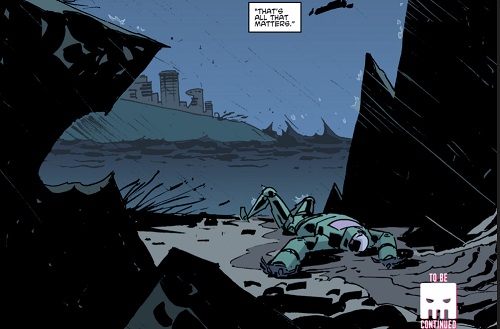 Dans un dernier élan de détermination, Krang relevait son corps robotique endommagé par le choc électrique et son impact contre le rocher. Il chutait de nouveau. Déséquilibré, il terminait de dévaler un escarpement jusqu’au bord de mer.