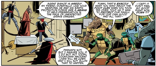- Bobby Curnow, sur le forum anglophone The Technodrome, révèle que l’inclusion d’une ninja Foot d’élite femme n’était pas dans le script du TMNT #79, mais bien du fait du dessinateur, Brahm Revel.