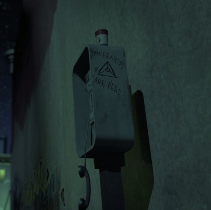 • Dans l’épisode L’invasion (S2 E26), un morceau de journal volant passe devant l’écran brièvement, où il est marqué qu’un homme à l’apparence d’un tricératops avait été aperçu.