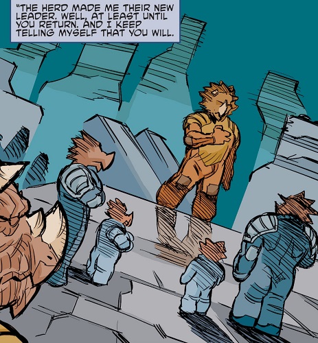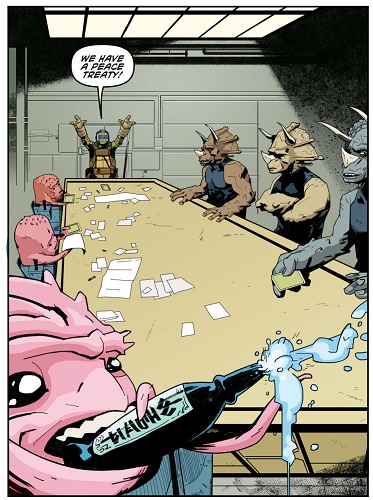 La bienveillance qu’elle portait à l’égard des neutrinos n’était pas désintéressée, loin de là. Elle avait passé un accord avec le roi Zenter afin que celui-ci leur trouve une nouvelle planète où habiter. Depuis la révolution contre les utroms, les triceratons vivaient dans leurs vaisseaux, sans planète propre (TMNT : Utrom Empire). Il était temps que cela s’arrête. Elle prévint le roi des neutrinos. S’il ne leur trouvait pas rapidement un nouvel espace où vivre, le procès de Krang serait le cadet de leurs soucis (TMNT #74).