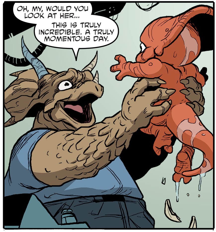 Une fois les deux peuples établis, Ch’Rell regrettait de voir les corps des triceratons tombés au combat être détruits par le feu à travers des rites ancestraux. Il préférait les voir servir d’hôtes pour les petits utroms qui avaient besoin de ces corps sans vie pour se développer. Mais très vite, la triceraton fut prise d’une nouvelle totalement inattendue. Elle attendait un bébé ! L’espèce était pourtant stérile et ne se reproduisait qu’à travers le clonage depuis Zog. Après plusieurs mois, elle donnait naissance à Seri (TMNT #125).
