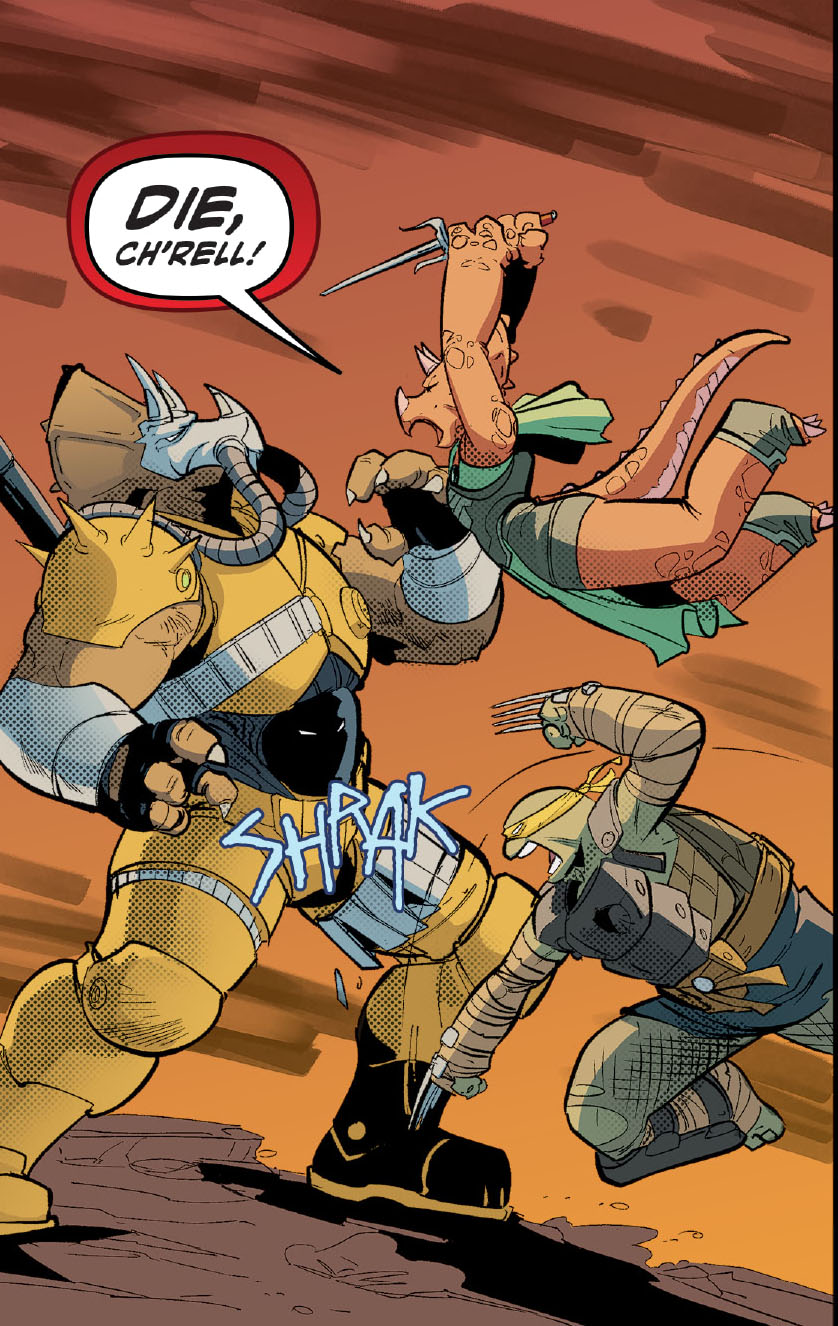 John Bishop envoya ses troupes sur l’île après avoir appris par Baxter Stockman où se trouvaient les triceratons (TMNT #82). Les défenses de l’île étant peu efficaces durant l’assaut, le général marginocéphale décida avec Ma’Riell de libérer le colonel Ch’Rell afin qu’il les aide sur le champ de bataille. Fin stratège, il se montrerait un atout indispensable pour contrecarrer l’offensive de l’Earth Protection Force. Mais l’utrom avait déjà été libéré par Kleve, qui avait pris sa place (TMNT #86). Le colonel sanguinaire n’acceptait pas la double trahison subie, tant par l’alliance avec les triceratons, anciennement esclaves des utroms, que du fait de ne pas avoir été sorti de stase au même moment que ses semblables. Il remettrait sa vengeance à plus tard, partant sur le champ de bataille (TMNT #87).
