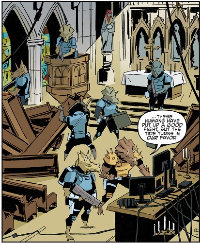 Gord se sacrifia pour son commandant. Cela rendit Zom folle et manqua de tuer Bishop. Elle fut arrêtée in extremis par les ninjas du Foot Clan et Splinter (TMNT #76). Dans la cohue, aidée des soldats qui la couvraient, ils purent prendre la fuite par une bouche de métro. Les tortues retrouvèrent leurs traces à l’aide des Flyborgs de Stockman. Essayant de comprendre ce qu’il se passait, Zom expliqua à ses amis tortues que Bishop les avait attaqués et qu’il était allié à une équipe de ninjas. Bien que les mutants cherchaient à les convaincre, la décision était prise : les triceratons allaient envahir la Terre (TMNT #77).